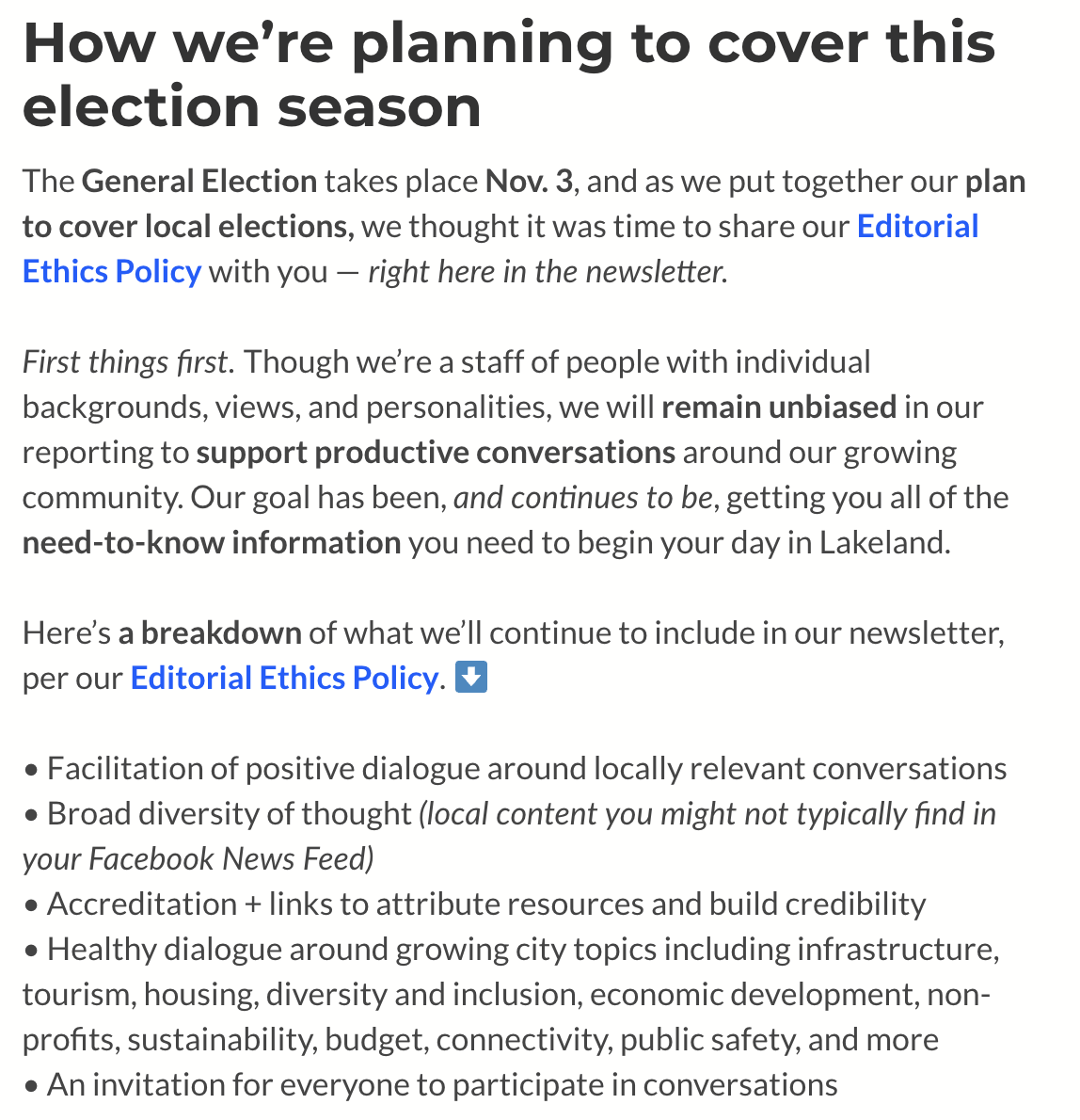 In an effort to be more transparent with their audience, 6AM city updated and posted its ethics policy online and linked to it from each of their daily newsletters. “Though we’re a staff of people with individual backgrounds, views, and personalities, we will remain unbiased in our reporting to support productive conversations around our growing community. Our goal has been, and continues to be, getting you all of the need-to-know information you need to begin your day,” the policy reads.