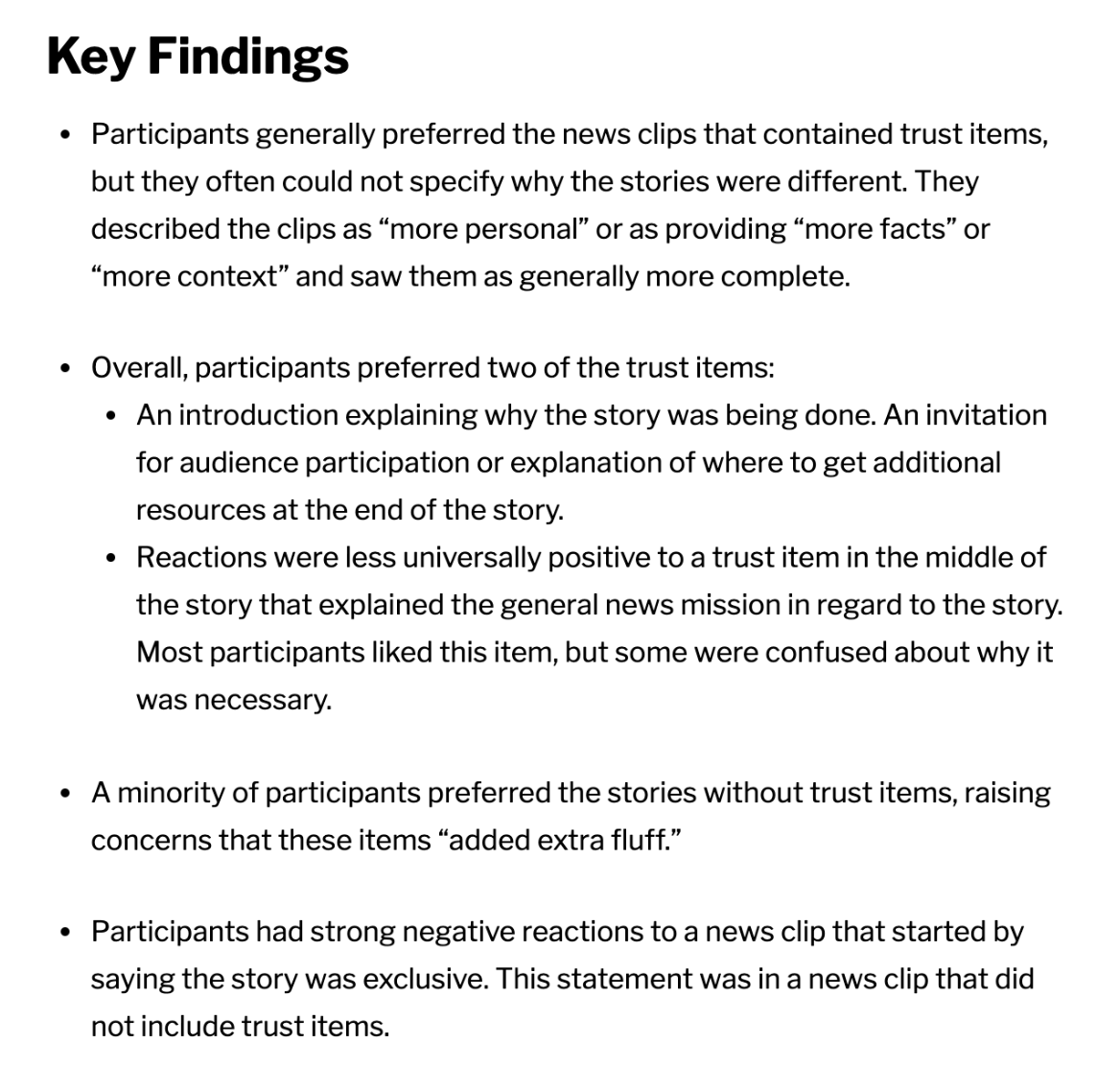 Through a series of focus groups, Trusting News and the Center for Media Engagement found TV newsrooms can build trust with their audiences by explaining why a story is covered, providing additional resources at the end of stories and inviting audience participation. Read the full research report here, and see a snippet of the research below.