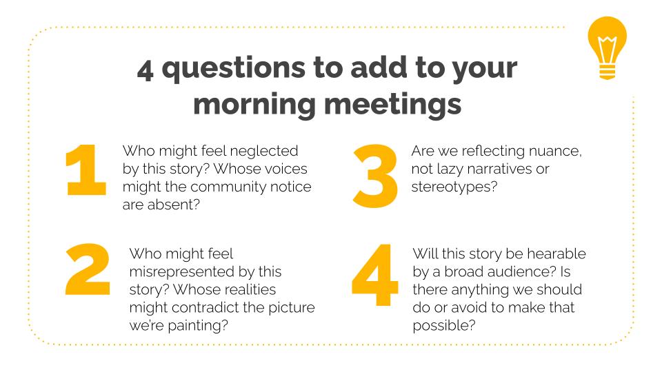 Try the questions out on one story a day, or on a couple stories a week. If your morning meeting seems like too big an ask, try it with a smaller team of curious, open-minded colleagues.