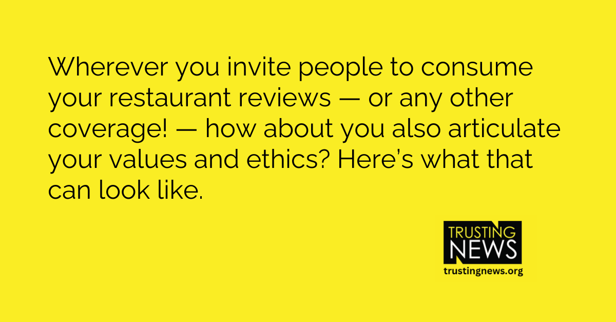 - It also recognizes the need to stand out from less service-oriented information sources. There is no shortage of restaurant reviews these days, but the mission behind them isn’t always a journalistic one. In many cases, people creating reviews are probably known by the restaurant, getting free meals, and unlikely to be critical if it might ruffle feathers or decrease future access.