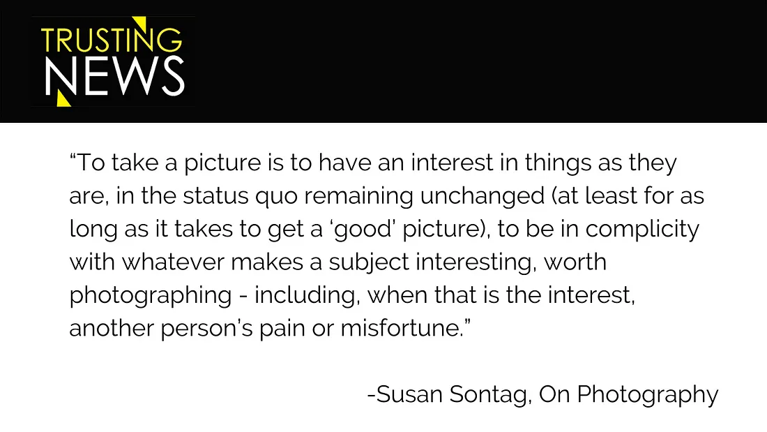 Trusting News would like to thank the following journalists for offering insights for this series: Nicole Frugé, Director of Visuals for the San Francisco Chronicle, Peter Huoppi, Director of Multimedia for The Day, Emilie Stigliani, Executive Editor for the Burlington Free Press, Mike Canan, Director of Journalism Strategies for the Scripps Howard Foundation, Patrick Boehler, Digital Strategy for Radio Free Europe, Ruth Serven, Editor for the education desk for Al.com and Susan Potter, Political Editor for the Atlanta Journal-Constitution.