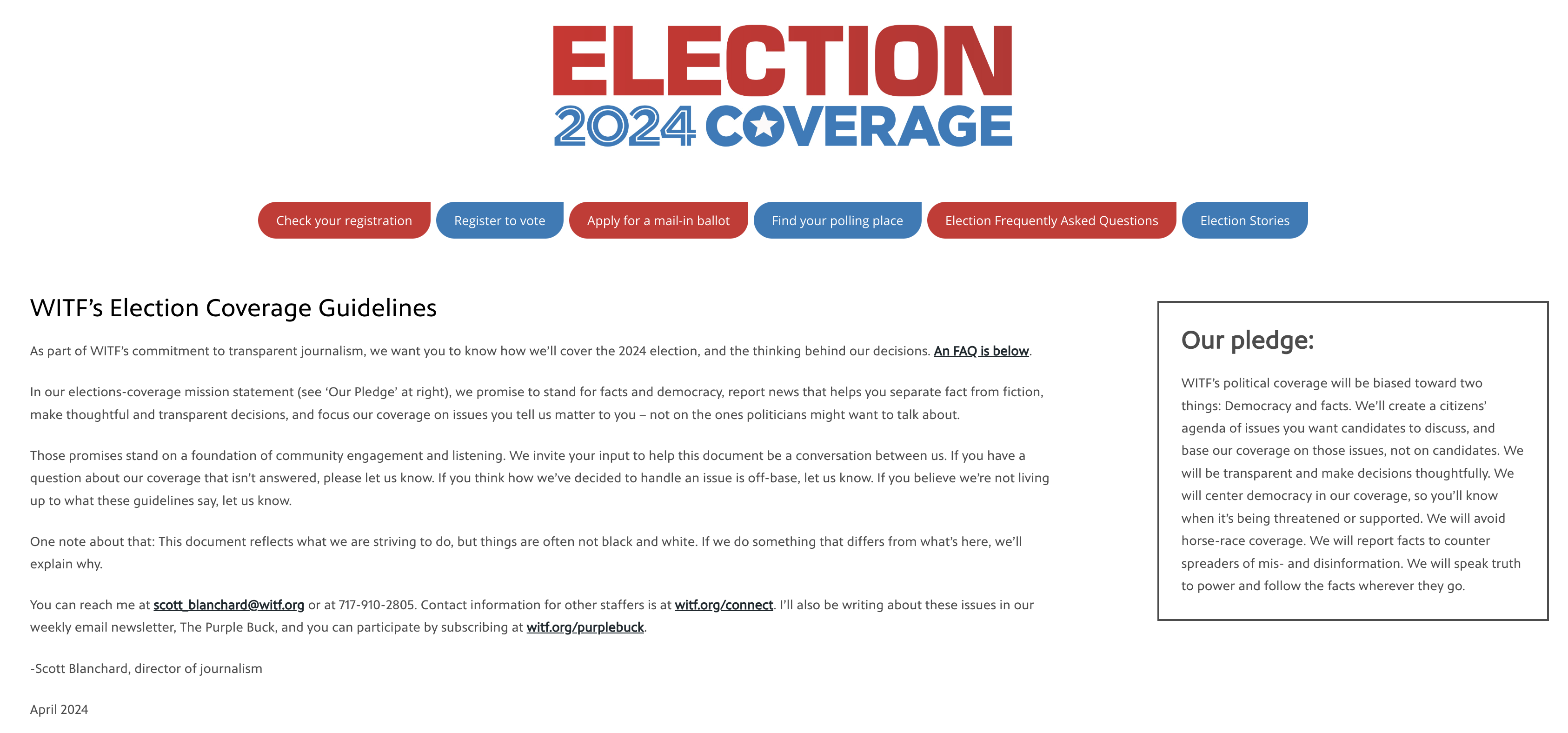 Check out this partial list of questions addressed in WITF’s FAQ. The staff talks about polling, fact-checking and use of labels, among other topics.