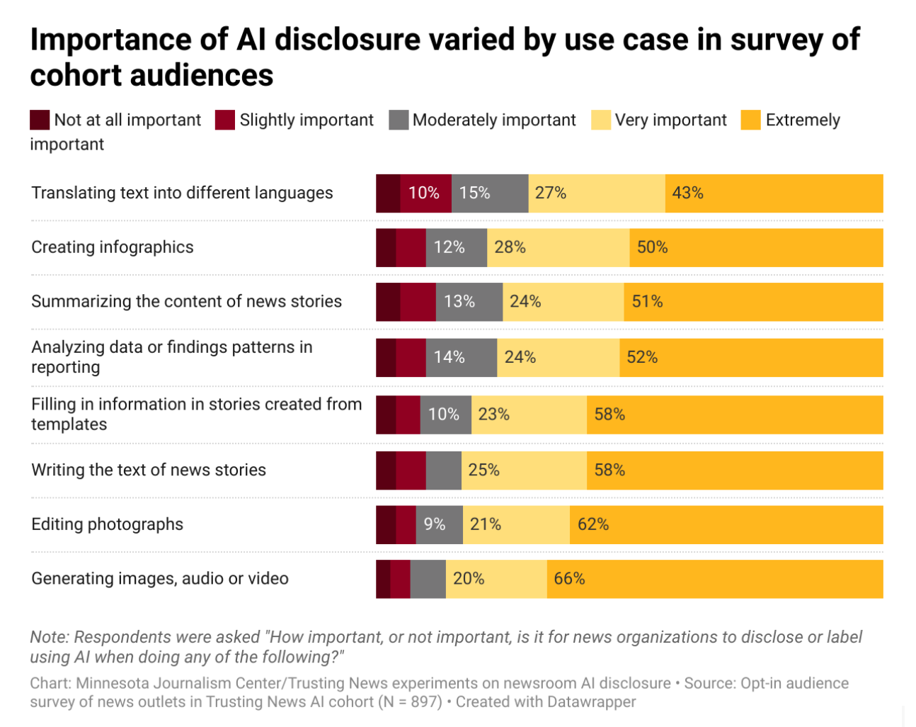 In our latest research, the only scenario where most people didn’t consider disclosure “extremely important” was when AI was used for translation — and even then, 43% of people still wanted that disclosed as well