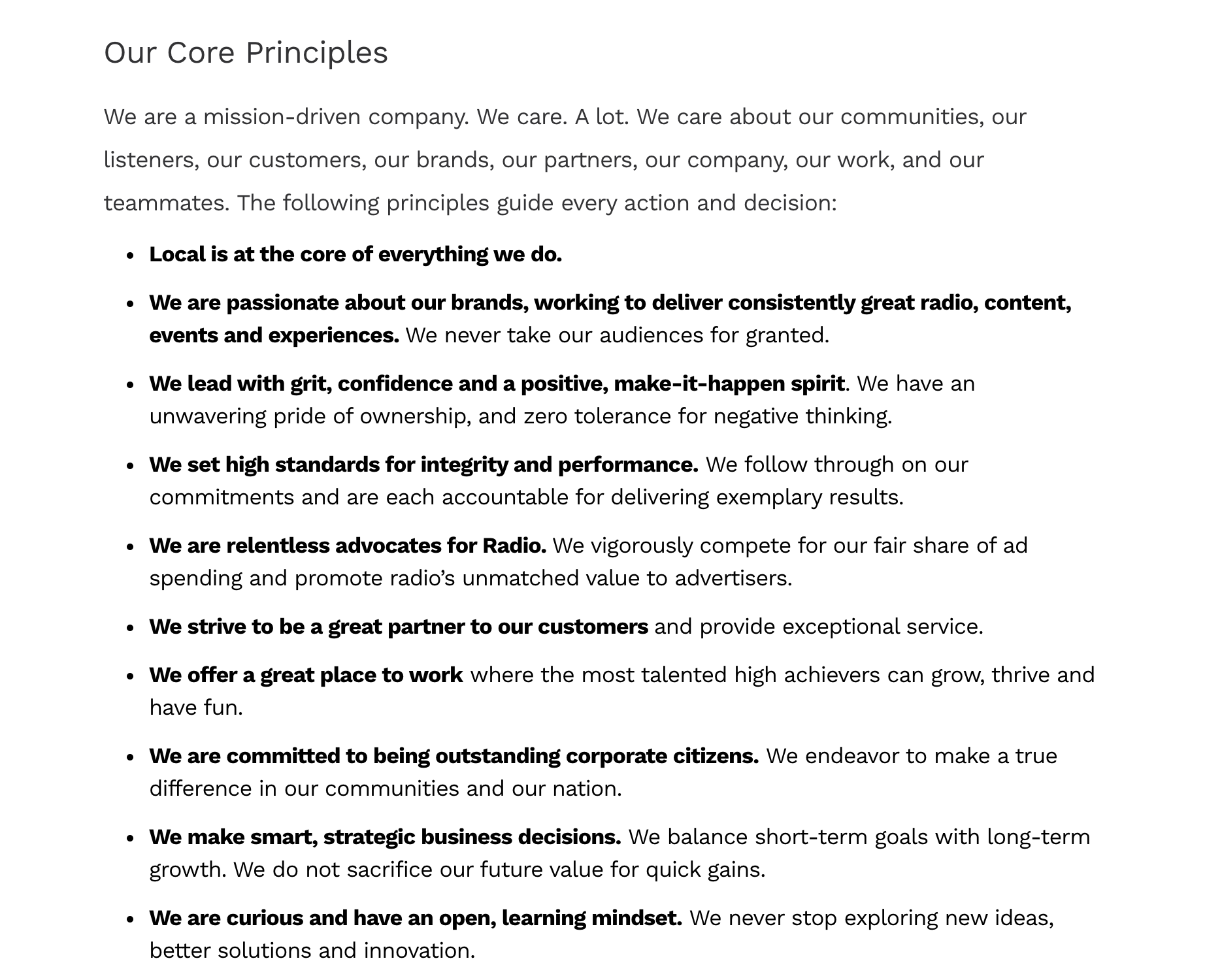 Posting your organization’s guiding principles in a prominent place is a good way to share your mission with your audience. Entercom did this by publicly posting the organization’s core principles on their website’s “About Us” page. “We are a mission-driven company. We care. A lot. We care about our communities, our listeners, our customers, our brands, our partners, our company, our work, and our teammates,” they wrote. This work was done independently from Trusting News but embodies the work we do.