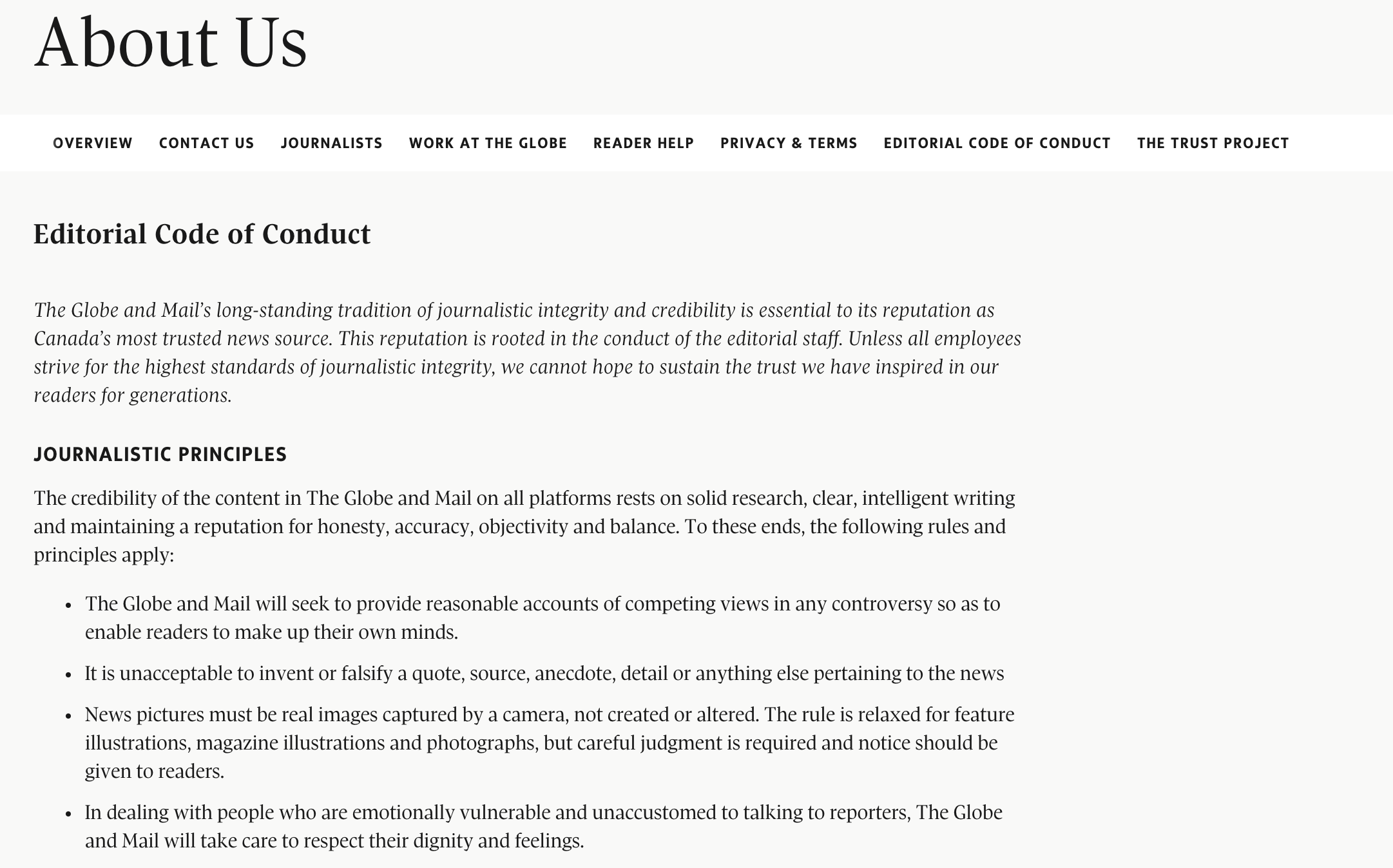 The Globe and Mail posted its Editorial Code of Conduct on its website, letting its audience know about their newsroom’s mission and goals. The code of conduct included information on many different aspects of the newsroom’s standards, including its policy for deleting comments and how their journalists fact-checked stories. “The Globe and Mail’s long-standing tradition of journalistic integrity and credibility
