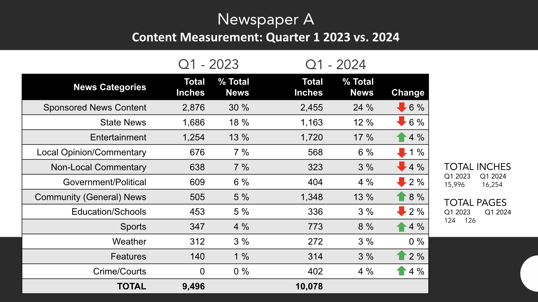 - The OPA staff coded a year’s worth of content by topic and type. They wrote definitions for different content categories, then measured how many column inches were used for each. How many newsrooms can actually answer how much space (or air time, or story pages) they dedicate to crime stories? Education stories? Sponsored (paid) content like obits and church listings?