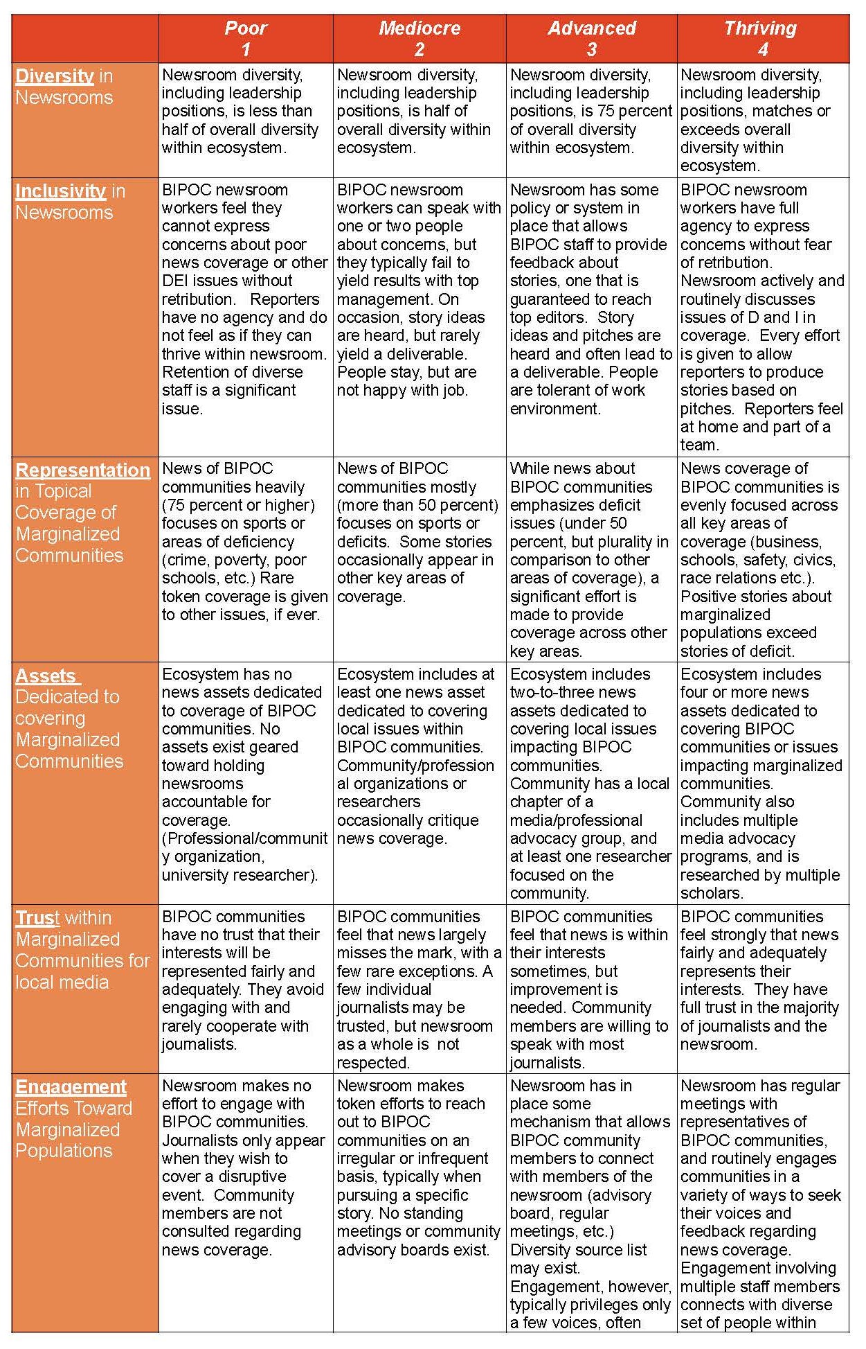 Once we make it to the bottom two rows, we’re asked to assess our own dedication to reaching out to communities of color. We’re also asked to assess how those communities feel about our journalism. Do they trust us to represent them fairly and adequately? Are they willing to engage with us?