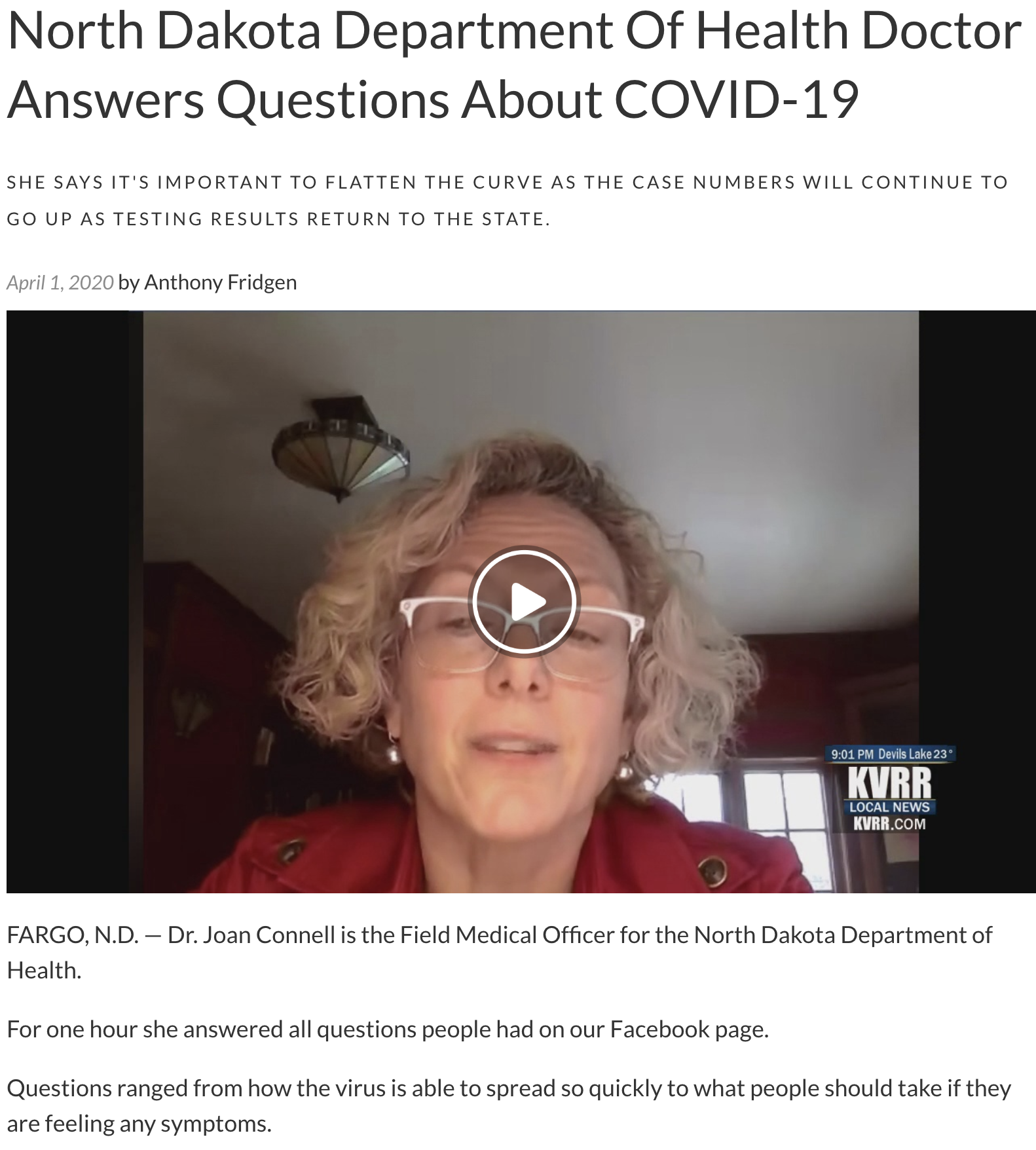 News station KVRR and the North Dakota Department of Health teamed up to bring a health expert on a Facebook Live to answer user questions about the COVID-19 outbreak. The station then featured parts of the Facebook Live in their newscast. During the newscast, the anchors acknowledged that many people were asking questions on their social media page about the pandemic, and then let users know they were attempting to answer those questions by bringing the expert back to do a Q&A. This work was done independently from Trusting News but embodies the work we do.