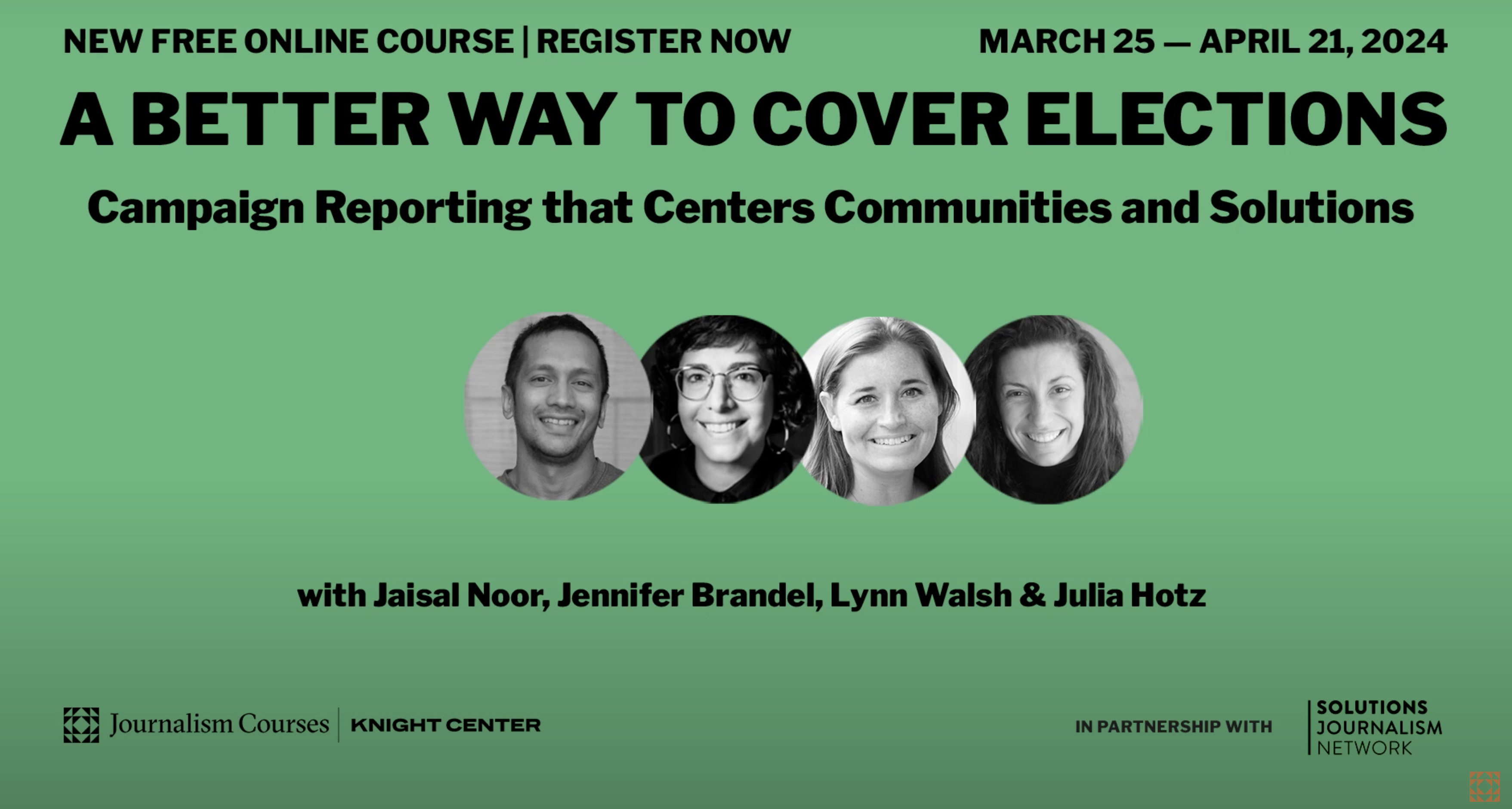 The course, organized by the Knight Center for Journalism in the Americas in partnership with The Solutions Journalism Network will be held from March 25- April 21, 2024. During the course, students will learn how to reinvent elections and campaign coverage to serve communities better and strengthen democracy.