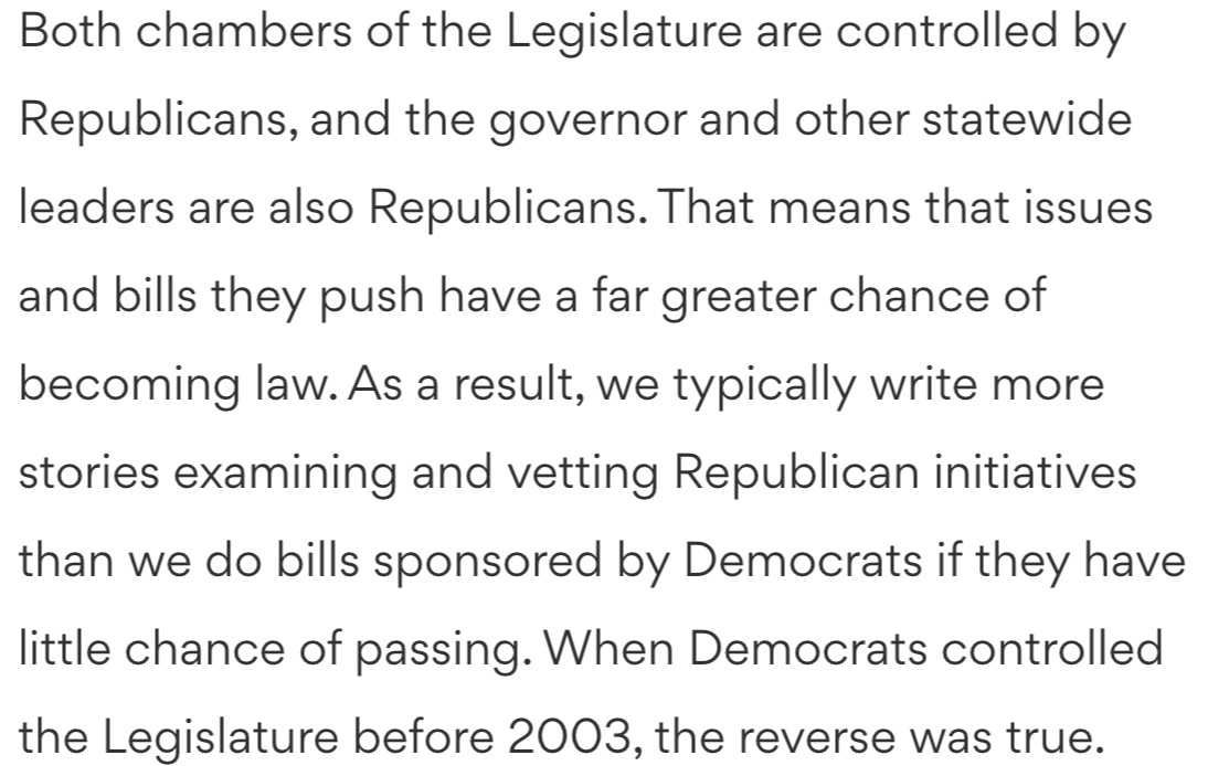 The Atlanta Journal-Constitution did an excellent job of explaining this and other elements of their approach to covering the Georgia legislature in this explainer. In it, they note how party control informs their priorities.
