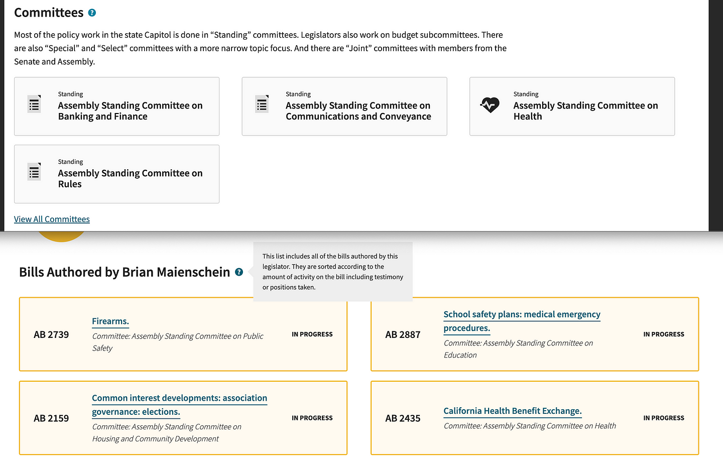 Information on bills authored. CalMatters has a section for current lawmakers detailing what bills they have introduced. My favorite section of this page is the committee information and the easy-to-understand explanation about how the committees are different. I also really appreciate the “?” icons throughout the page that provide context and details about what information is being provided. The interest group rankings also provided useful information to help me in making a decision. (A lot of this information would not be available if the candidate is not currently in office). One last favorite from this page: the top/bottom list for most and least votes missed in the current legislative session.