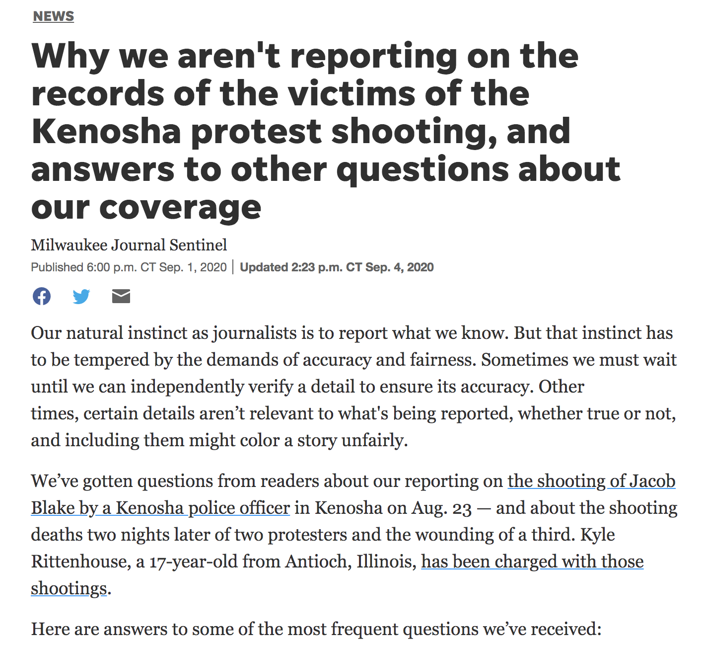 After two back-to-back shootings in Kenosha that garnered national attention, the Milwuakee Journal Sentinel wrote a column answering reader questions and explaining it’s reporting process, including why they didn’t report on the criminal record of the victims involved in both situations. “Our natural instinct as journalists is to report what we know. But that instinct has to be tempered by the demands of accuracy and fairness,” the column read. “Sometimes we must wait until we can independently verify a detail to ensure its accuracy. Other times, certain details aren’t relevant to what’s being reported, whether true or not, and including them might color a story unfairly.” The newsroom also posted the column in a Q&A style format on its Instagram page, gaining more than 1,000 likes and dozens of comments thanking the paper for its thoughtful coverage.