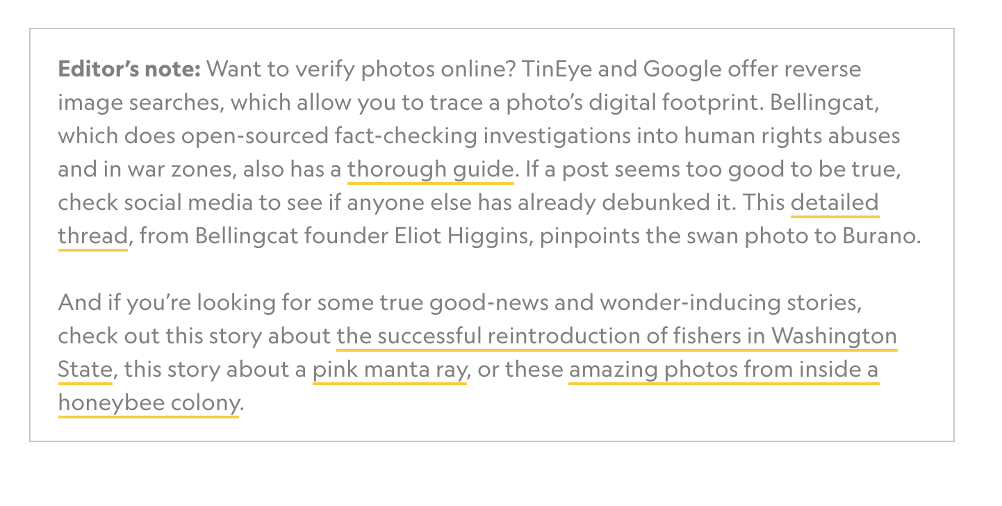 In a story highlighting “fake news” about animals amid the coronavirus outbreak, National Geographic included an editor’s note that alerted readers to online tools they could use to help verify if photos are real or have been altered. “If a post seems too good to be true, check social media to see if anyone else has already debunked it,” the note read. By telling readers how to spot altered photos, they are establishing that they don’t support “fake” news and are actively trying to quell misinformation. This work was done independently from Trusting News but embodies the work we do.