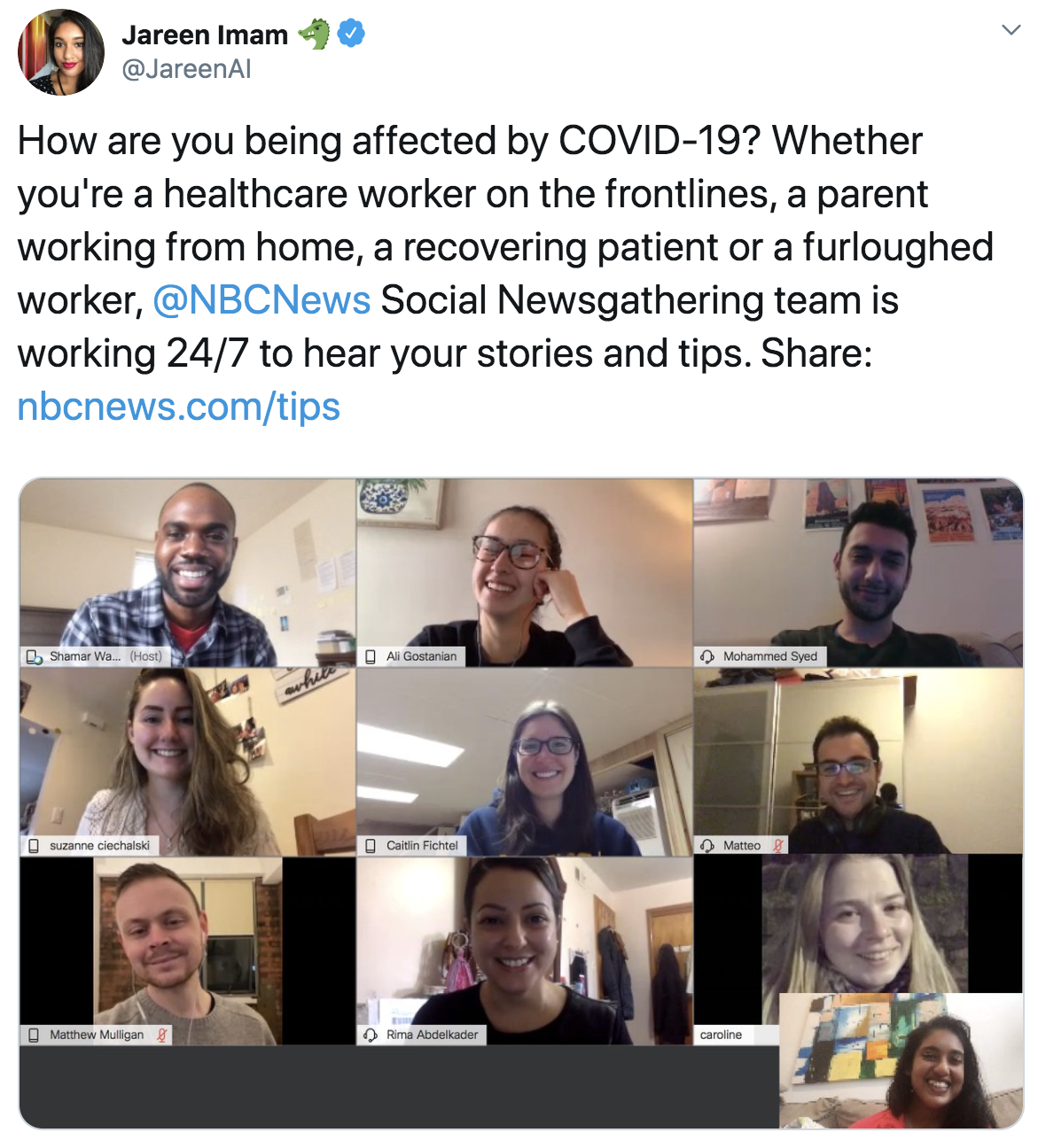 Jareen Imam, the Director of Social Newsgathering at NBC, shared a screenshot of their team meeting remotely during the coronavirus outbreak and prompted users to submit their questions. “How are you being affected by COVID-19? Whether you’re a healthcare worker on the frontlines, a parent working from home, a recovering patient or a furloughed worker, @NBCNews Social Newsgathering team is working 24/7 to hear your stories and tips,” the Tweet read. Not only does this build transparency, but it also reminds users that their journalists are real people who are part of their local communities, weathering this storm along with them.