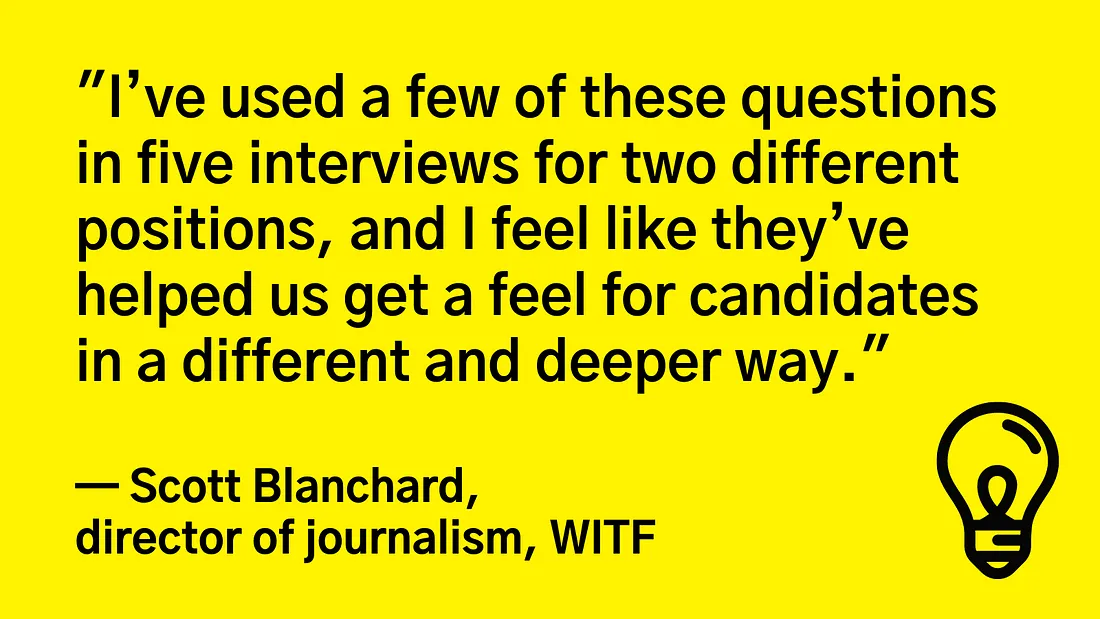 Scott Blanchard, director of journalism, WITF: “I’ve used a few of these questions in five interviews for two different positions, and I feel like they’ve helped us get a feel for candidates in a different and deeper way. The guide can help us in making the right hire, and asking these kinds of questions also allows us to know the successful candidate a little better before they get here, which can be important as they become part of the team.”
