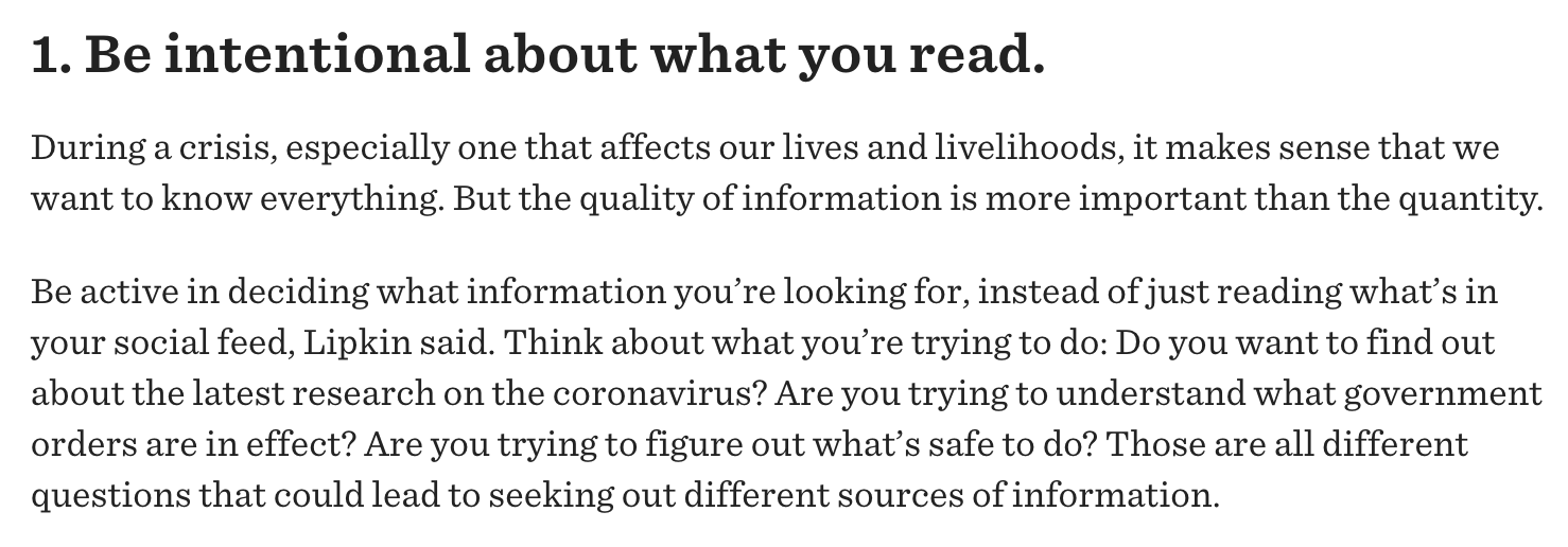 Consuming news can be overwhelming, especially during the COVID-19 outbreak when there seems to be an almost constant stream of updates from various different media outlets. The Philadelphia Inquirer addressed this directly by publishing an article about how the public can be smarter about finding trustworthy news during the pandemic. It included information from media literacy experts, a list of resources for sorting through potentially false or misleading news and strategies to help their users become smarter news consumers. “During a crisis, especially one that affects our lives and livelihoods, it makes sense that we want to know everything. But the quality of information is more important than the quantity,” the article reminded readers. This work was done independently from Trusting News but embodies the work we do.