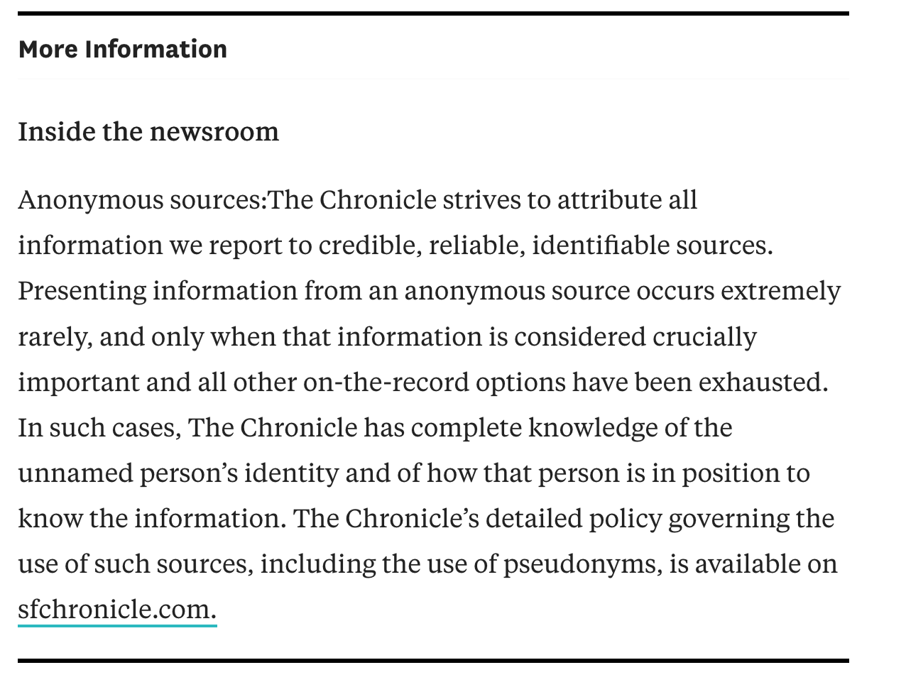 When quoting an anonymous source in an article about the spread of COVID-19 at a local nursing home, the San Fransisco Chroncile included a box that explained what an anonymous source is and the newsroom’s policies for using them. “The Chronicle strives to attribute all information we report to credible, reliable, identifiable sources. Presenting information from an anonymous source occurs extremely rarely, and only when that information is considered crucially important and all other on-the-record options have been exhausted,” the box read. “In such cases, The Chronicle has complete knowledge of the unnamed person’s identity and of how that person is in position to know the information.”