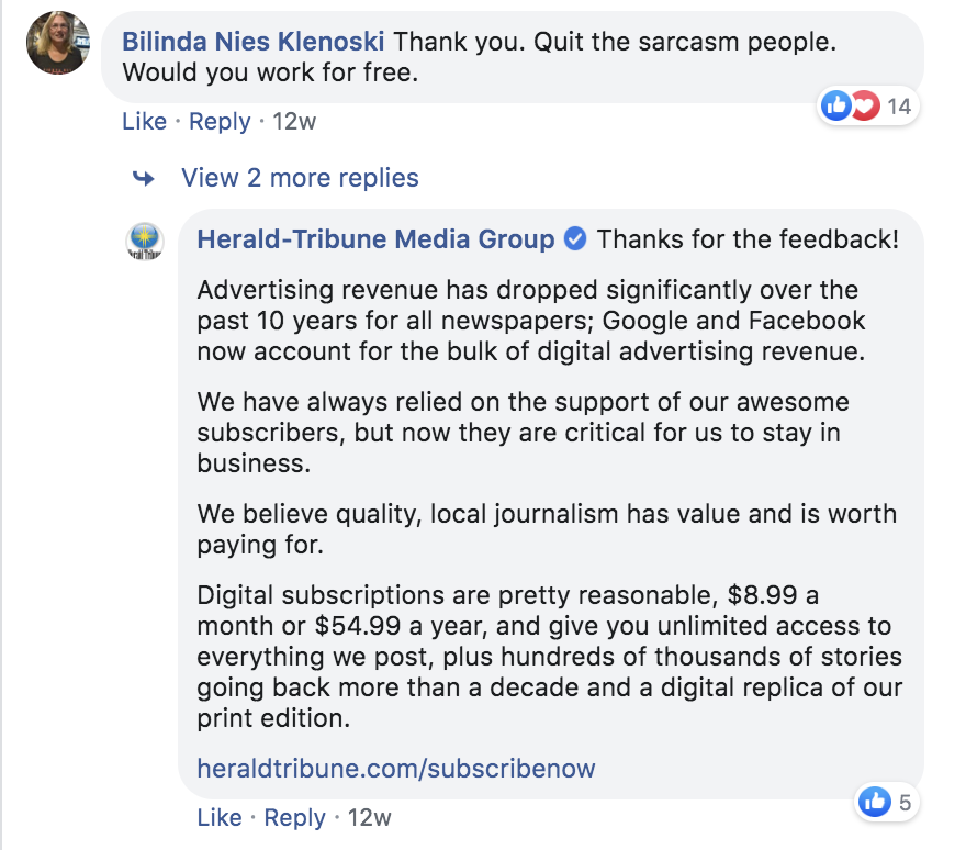 After receiving complaints about its paywall on Facebook, the Herald-Tribune Media Group used the opportunity to explain why paying subscribers are an important piece of the newsroom’s funding. “We have always relied on the support of our awesome subscribers, but now they are critical for us to stay in business,” their comment read. “We believe quality, local journalism has value and is worth paying for.
