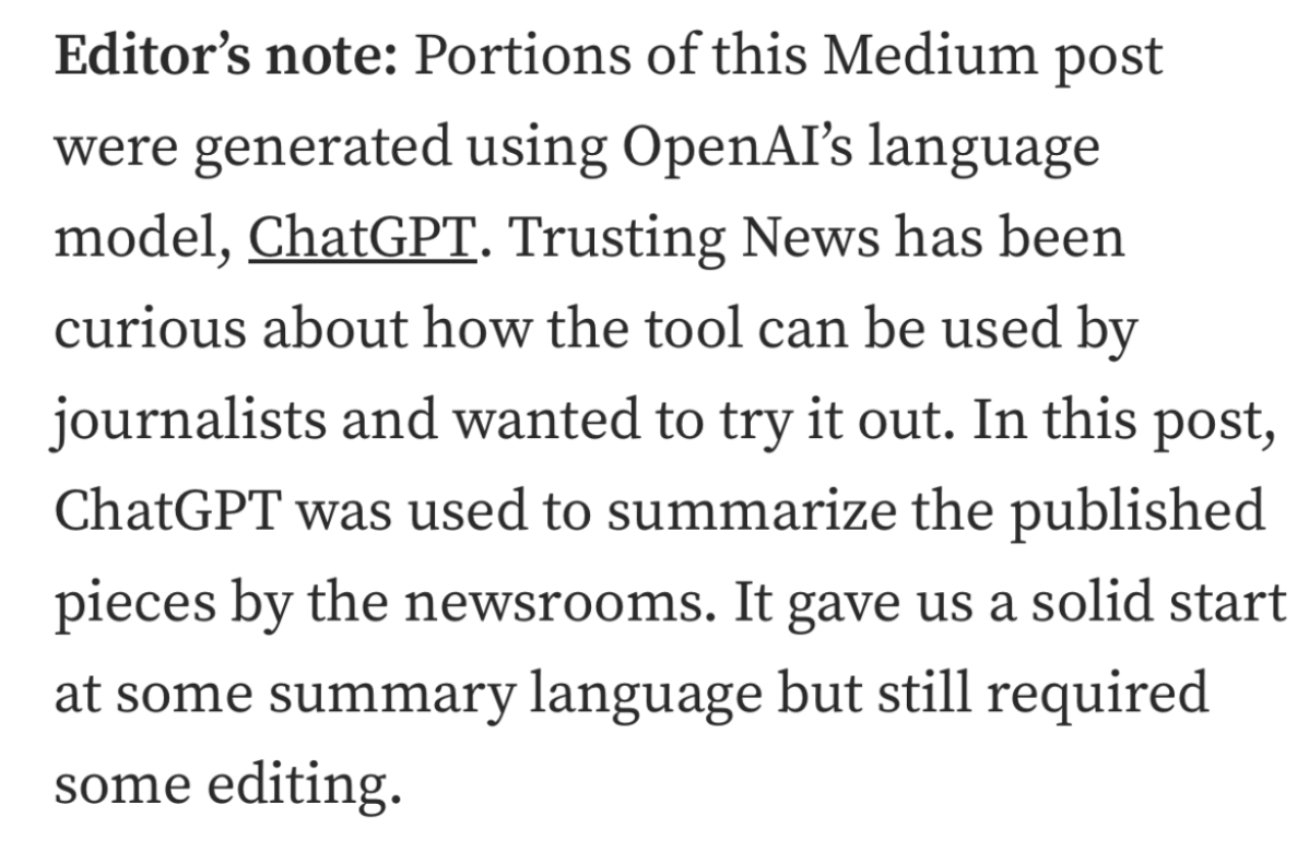 SFGate makes it clear they are experimenting with AI but no content will be published without an editor (a human) reviewing it. We think making this distinction between whether or not there was a human involved in producing content will be something news consumers want to know and probably something they have strong preferences/opinions about. They also say content will be fact-checked before published and have an opportunity for their users to contact them with questions and feedback.
