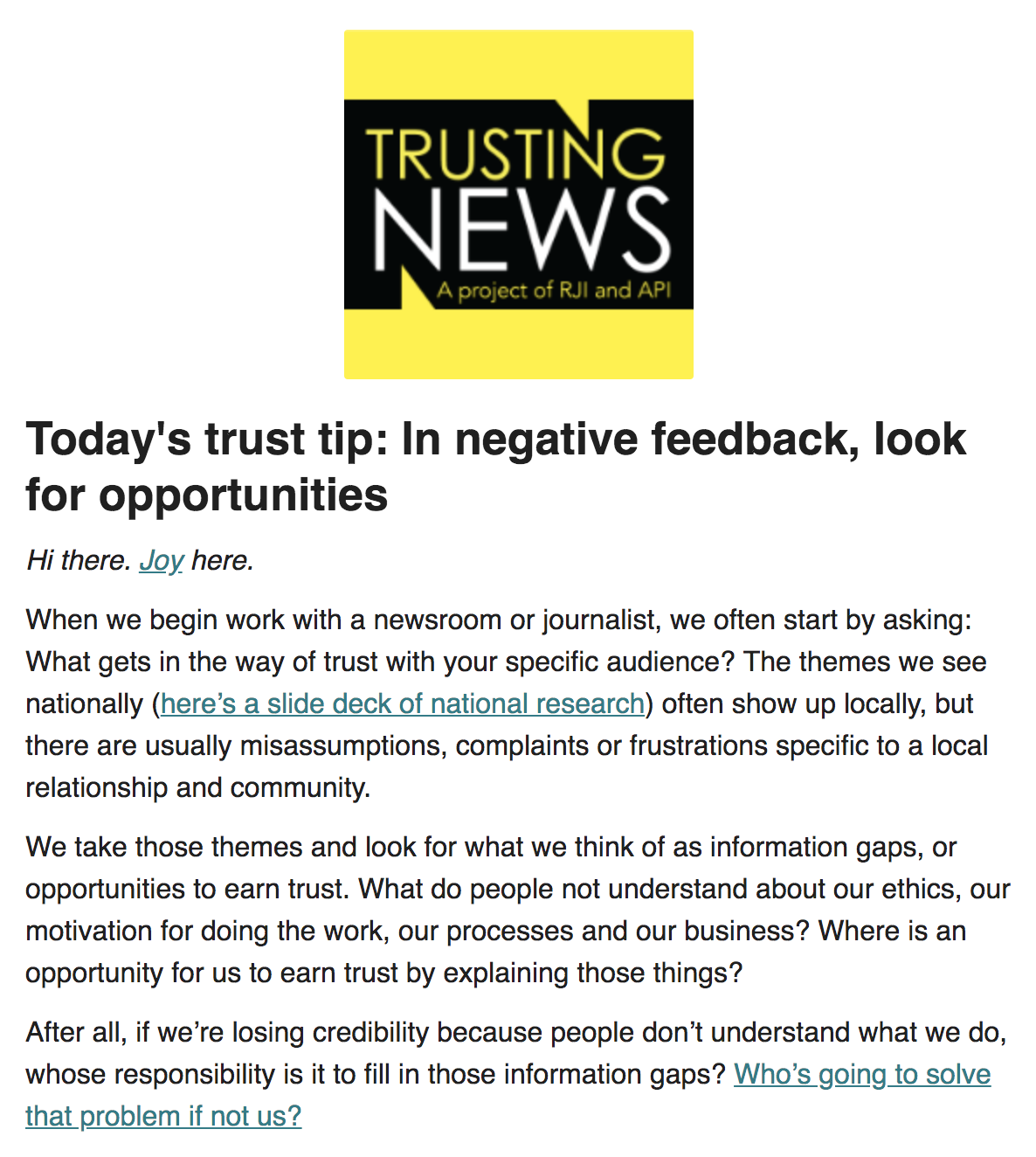 Project manager Mollie Muchna (she/her) has spent the last 10 years working in audience and engagement journalism in local newsrooms across the Southwest. She lives in Tucson, Arizona, where she is also an adjunct professor at the University of Arizona’s School of Journalism. She can be reached at mollie@trustingnews.org and on Twitter @molliemuchna.