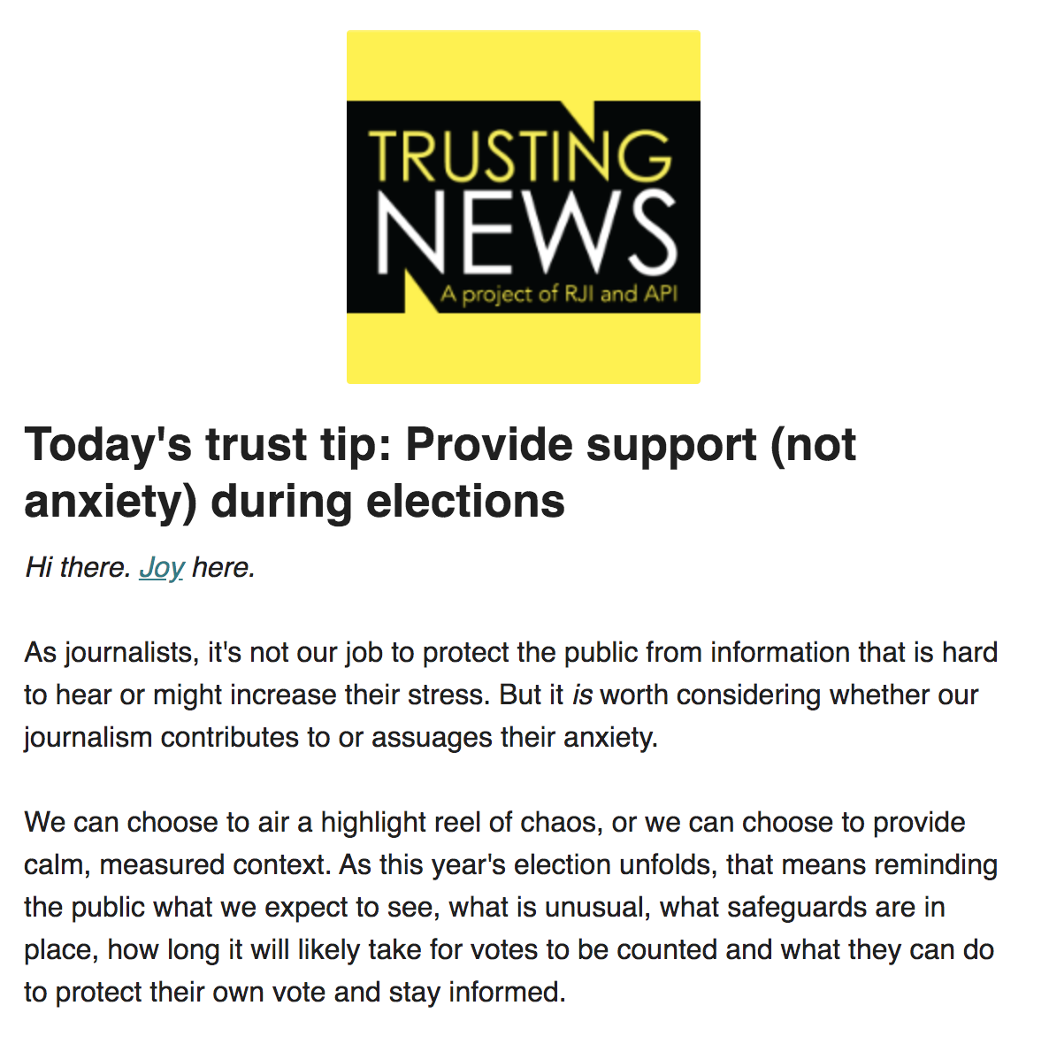 As journalists, it’s not our job to protect the public from information that is hard to hear or might increase their stress. But it is worth considering whether our journalism contributes to or assuages their anxiety. We can choose to air a highlight reel of chaos, or we can choose to provide calm, measured context. As this year’s election unfolds, that means reminding the public what we expect to see, what is unusual, what safeguards are in place, how long it will likely take for votes to be counted and what they can do to protect their own vote and stay informed. A significant chunk of your audience is probably exhausted by news coverage. Back in February, a Pew Research Center survey showed that two-thirds of U.S. adults are worn out by the news. And it’s fair to say the volume of news hasn’t decreased this year! So, how can journalists respond to that mood in a way that respects the experience of consuming their product? In a crowded, exhausting information landscape, how can your journalism stand out as a responsible, important part of your audience’s information diet? More from this edition can be found here and to receive the tips in your inbox each week click here.