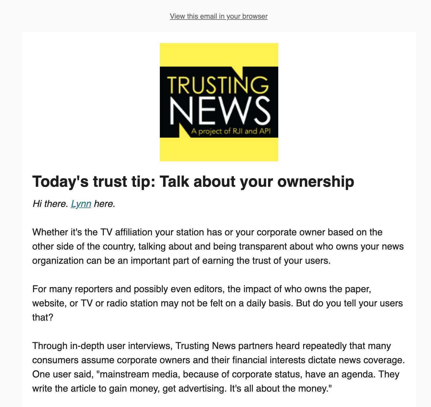 Assistant director Lynn Walsh (she/her) is an Emmy award-winning journalist who has worked in investigative journalism at the national level and locally in California, Ohio, Texas and Florida. She is the former Ethics Chair for the Society of Professional Journalists and a past national president for the organization. Based in San Diego, Lynn is also an adjunct professor and freelance journalist. She can be reached at lynn@TrustingNews.org and on Twitter @lwalsh.