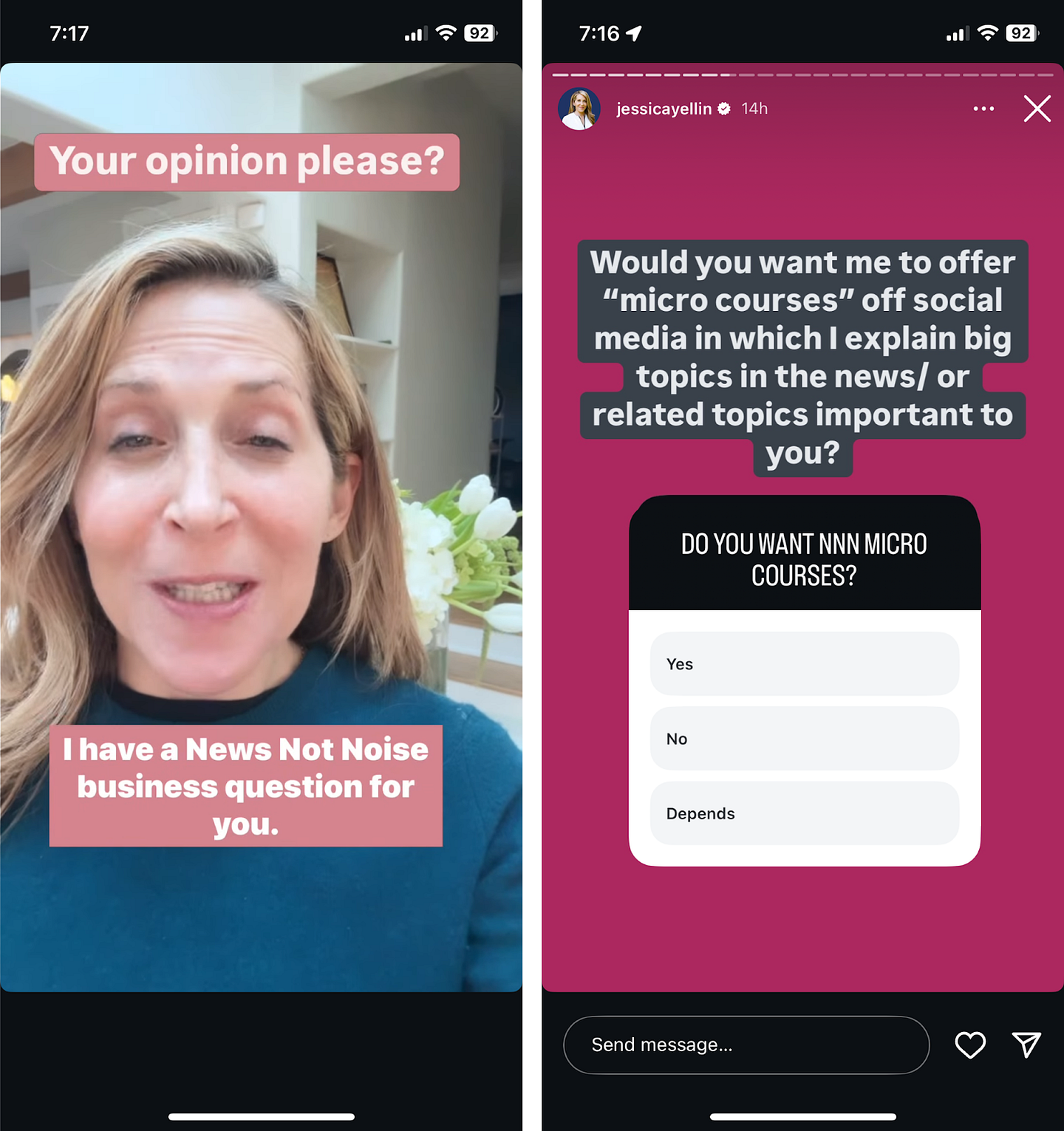 Jessica Yellin of News Not Noise routinely invites questions, opinions and dog photos. This week, she said she was considering a new offering — paid micro courses on specific topics — and asked people to weigh in on what topics they’d like to see covered and how much they might be willing to pay. This is done in a more personal way than news outlets often do it — viewers feel like they’ll be doing her a favor if they weigh in. And her pattern is to share back what she hears, which makes people feel both like she’s listening and like they might be included in a future story.