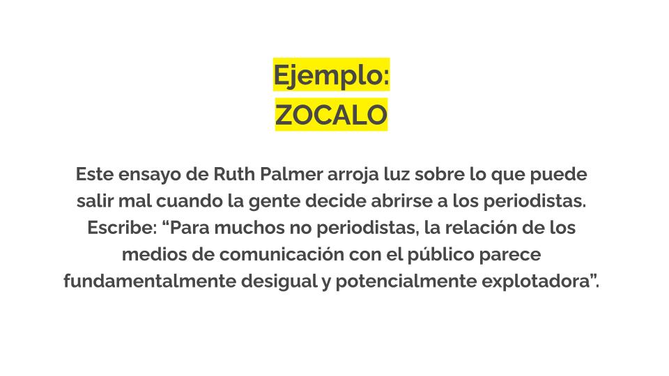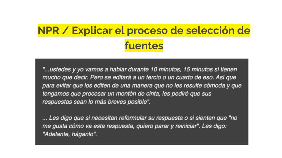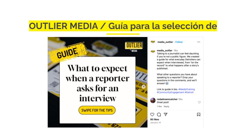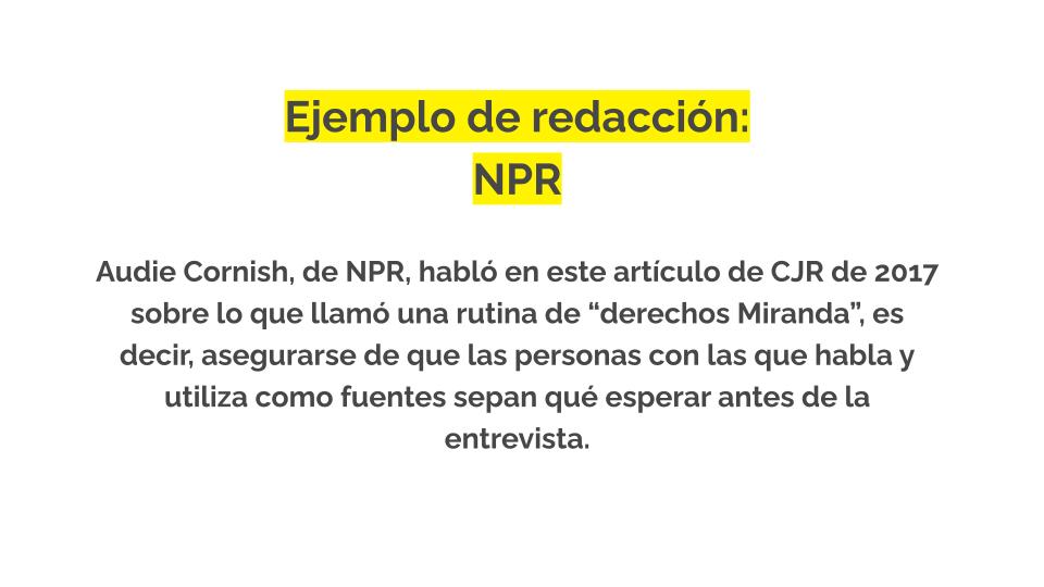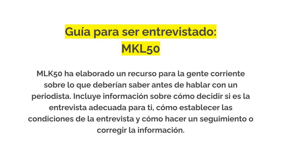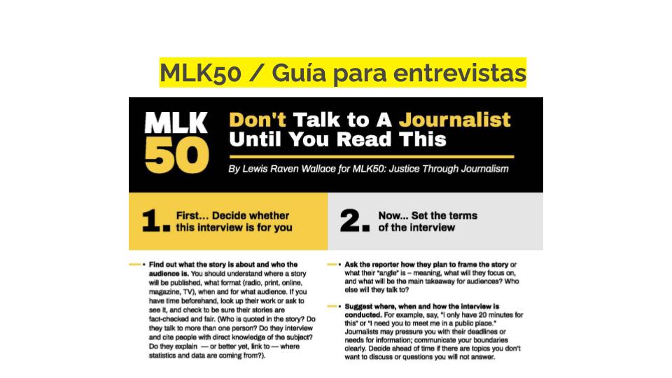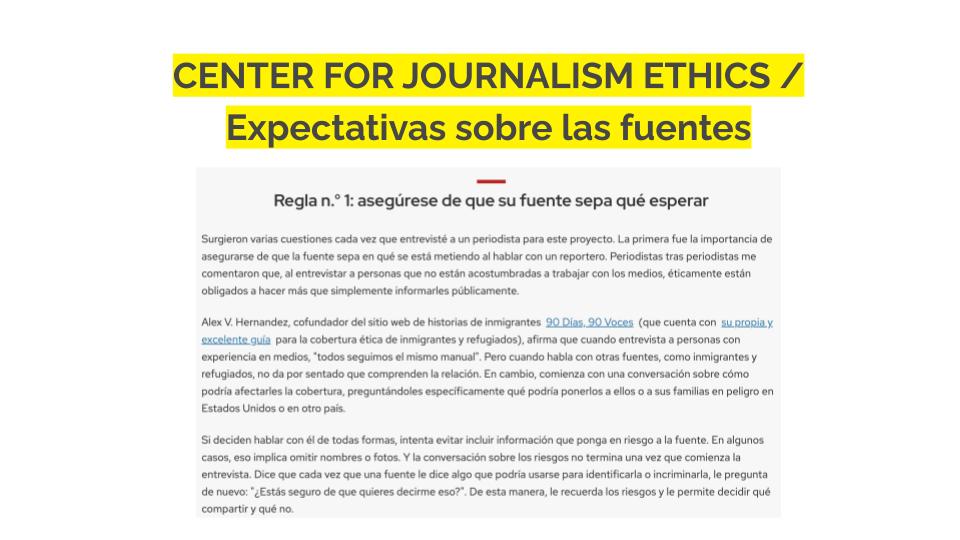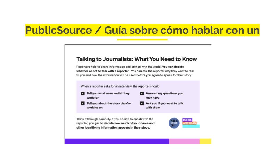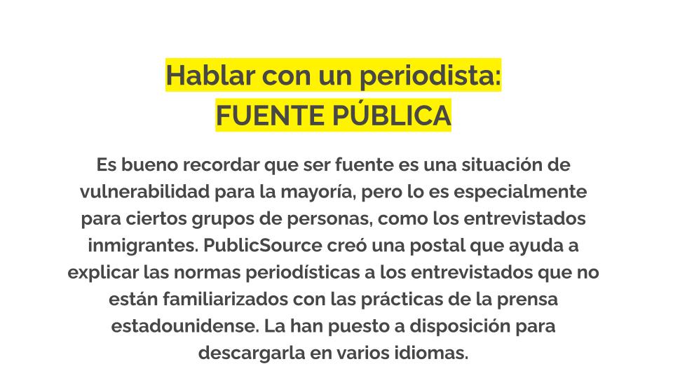 Es bueno recordar que ser fuente es una situación de vulnerabilidad para la mayoría, pero lo es especialmente para ciertos grupos de personas, como los entrevistados inmigrantes. Nos encanta este recurso en formato de postal creado por PublicSource que ayuda a explicar las normas periodísticas a los entrevistados que no están familiarizados con las prácticas de la prensa estadounidense. Puedes descargarlo en varios idiomas aquí.