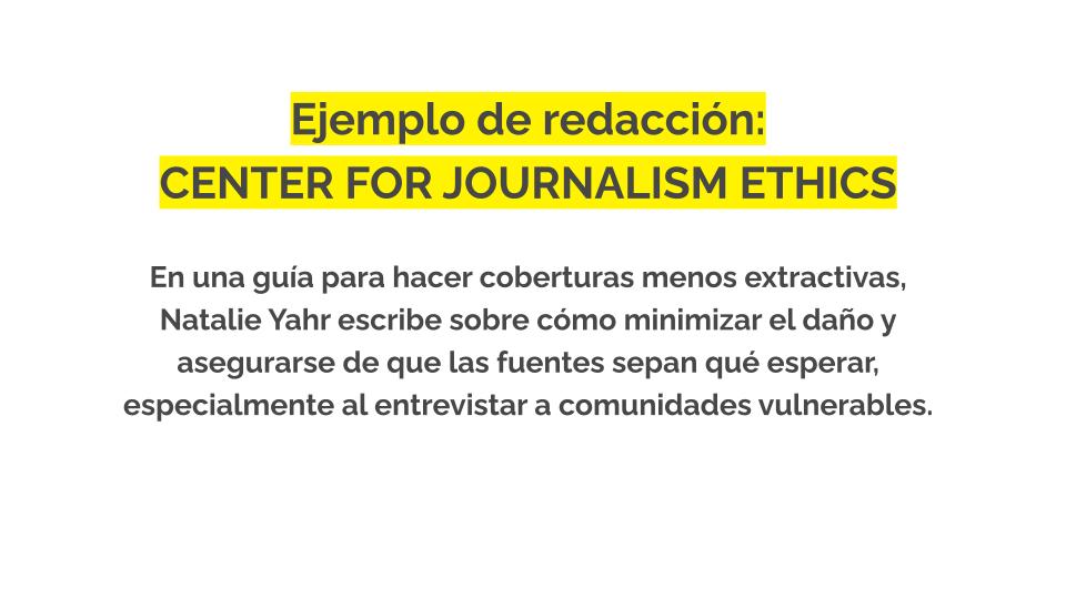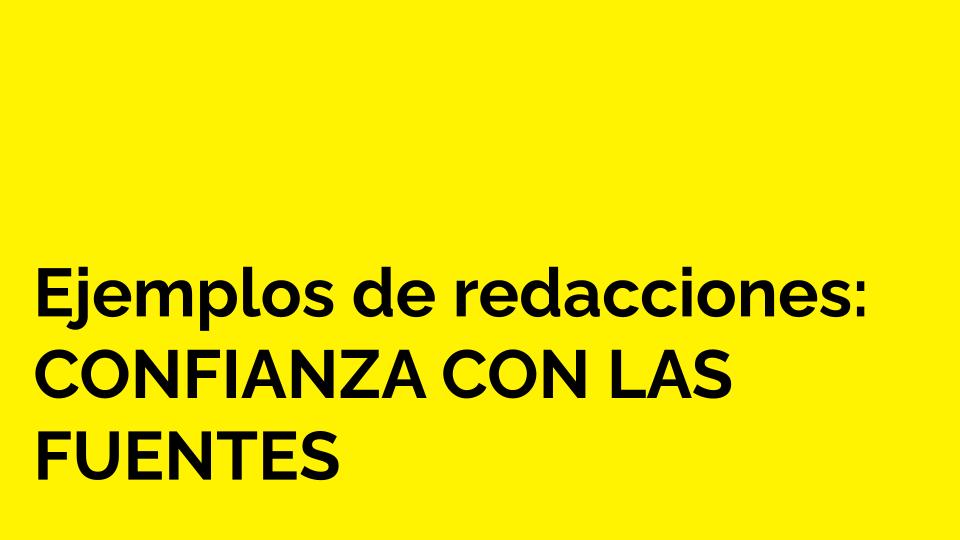 Para inspirarte, estos son algunos ejemplos de cómo los periodistas crean confianza con las fuentes. Para ver más ejemplos de redacciones, consulta nuestra base de datos de ejemplos de redacciones.