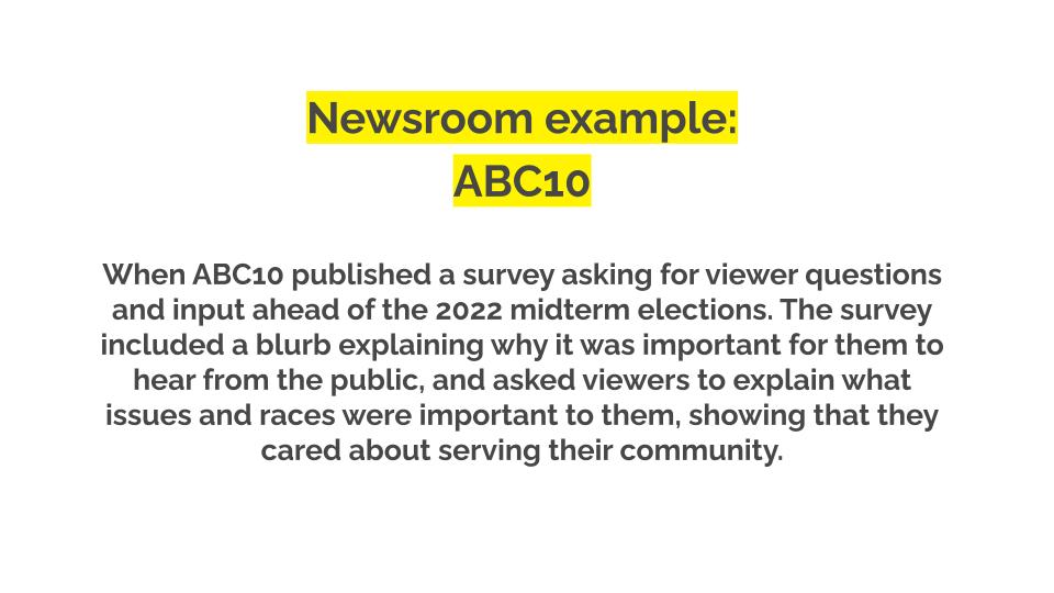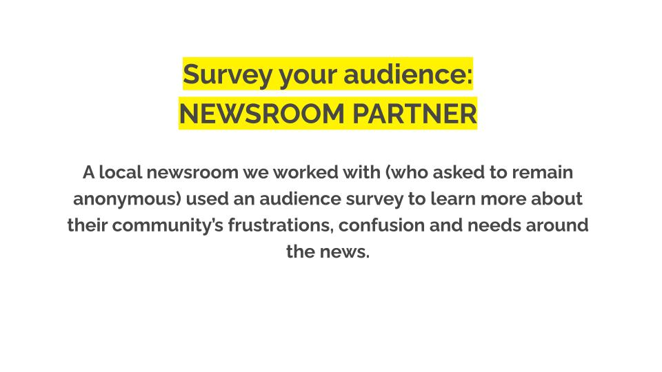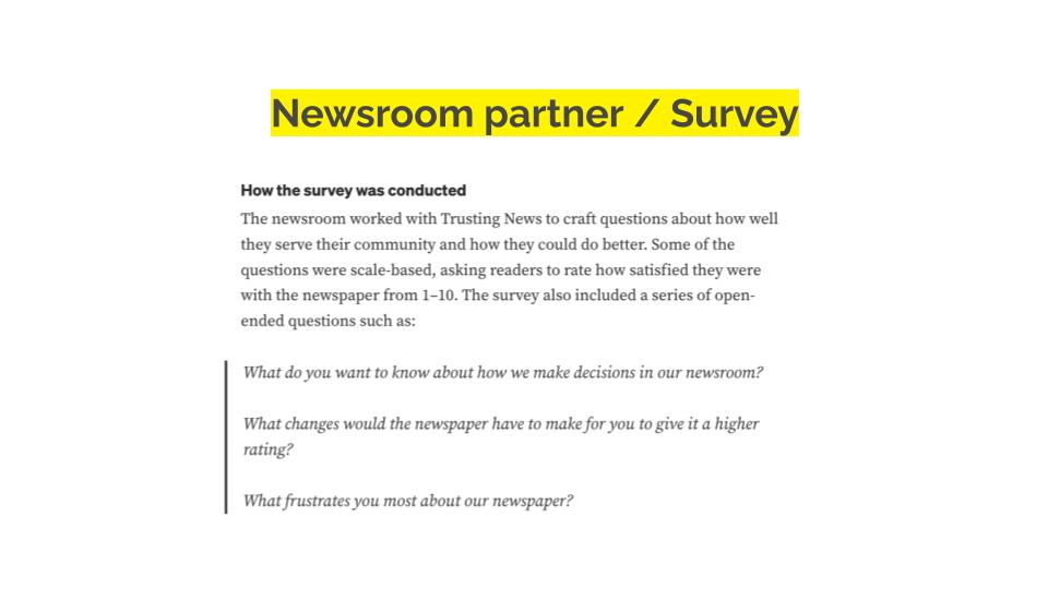 • Ask some quantitative questions you can repeat over time for benchmarking (How likely would you be to recommend this news outlet to a friend? To what extent do you find that this outlet provides accurate, credible information?)