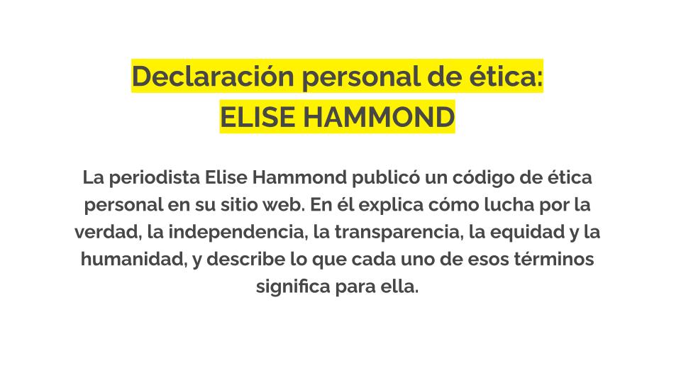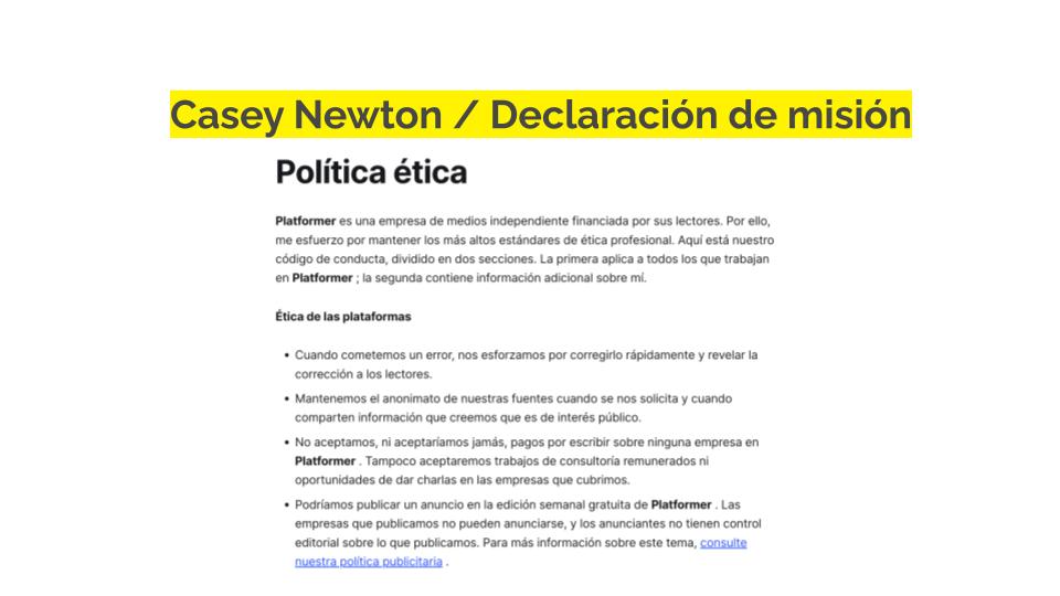 Por eso es importante que te distingas por tener clara la ética que hay detrás de tu forma de hacer periodismo. Una forma de hacerlo es mediante la creación de una declaración de ética o política de ética que detalle tus mejores prácticas éticas.