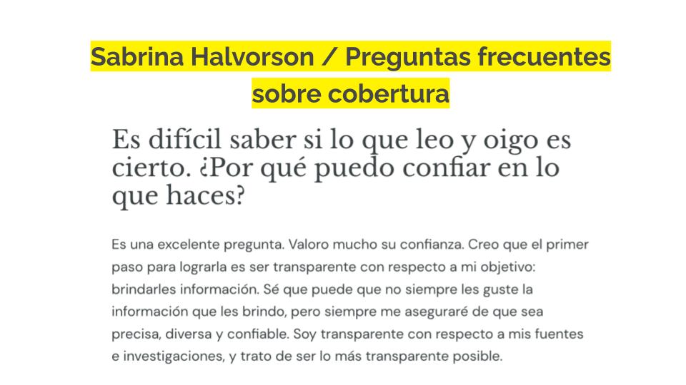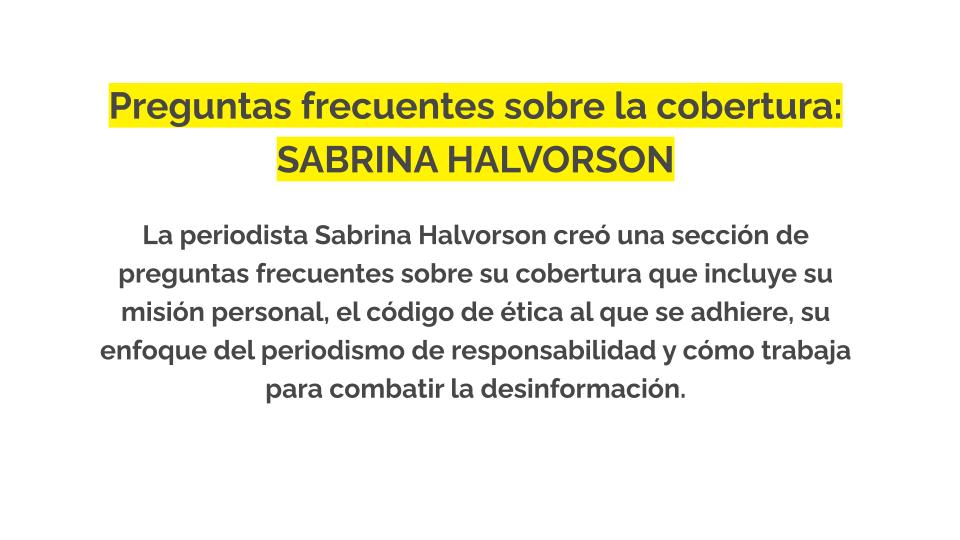 Este es un ejemplo de cómo puede ser una sección de preguntas frecuentes: la periodista Sabrina Halvorson ha añadido a su sitio web una sección de preguntas frecuentes que explica rápidamente su misión, su ética, el enfoque de su trabajo, así como algunas políticas de cobertura.