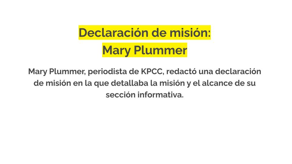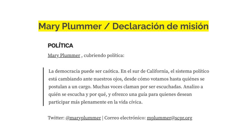 La emisora del sur de California KPCC/LAist hizo que cada uno de sus periodistas y productores creara declaraciones de misión que explicitan los temas y cuestiones que cada reportero se compromete a cubrir. Las declaraciones de misión también les dieron a los periodistas la oportunidad de compartir más sobre sus conexiones personales con el trabajo que hacen, lo que los llevó a esta cobertura y por qué es importante para ellos.