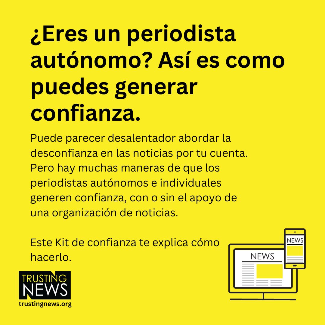 También sabemos que el panorama de los medios de comunicación está cambiando rápidamente, y que hay mucho solapamiento entre los periodistas que trabajan como autónomos y los que se lanzan por su cuenta como creadores de contenidos independientes. Aunque este Kit de Confianza se centra en ayudar a los periodistas autónomos, en Trusting News también nos centramos en apoyar a los periodistas creadores independientes. Puedes leer más sobre ese trabajo aquí.
