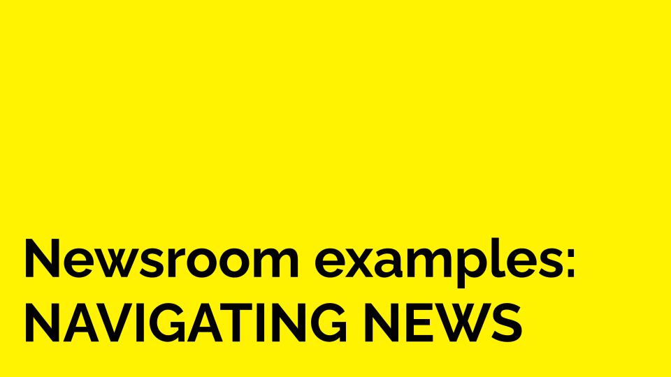 For inspiration, here are some examples of how newsrooms are helping their audience navigate the news. For more newsroom examples, check our our newsroom example database.