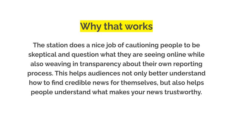 We know people don’t give journalists the benefit of the doubt. That means people won’t automatically assume you’re credible, so it’s up to you to be transparent about your reporting process and explain how it works. Think about the ways you can pull back the curtain on how you produce your work, especially places like social media where audiences interact with content very briefly and might only glance at a headline before scrolling on. Start by including what your reporting process looks like in the post chatter. Share what makes your sources credible or how you found documents. Explain how you verified information. And take the time to respond to comments accusing you of misinformation or “fake news.”