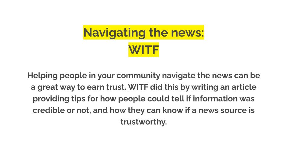 It’s easy to get defensive when people question your credibility. But shouldn’t we encourage our audience to be skeptical of what they consume? Aren’t we as journalists also skeptical by nature? Instead of getting frustrated and throwing up your hands, encourage your audience to question what they see and proactively give them tools to help decipher good information from bad information. (Check out the section directly above, “Help people spot bad information” to see some News Literacy Project tools you can share directly with your audience.)