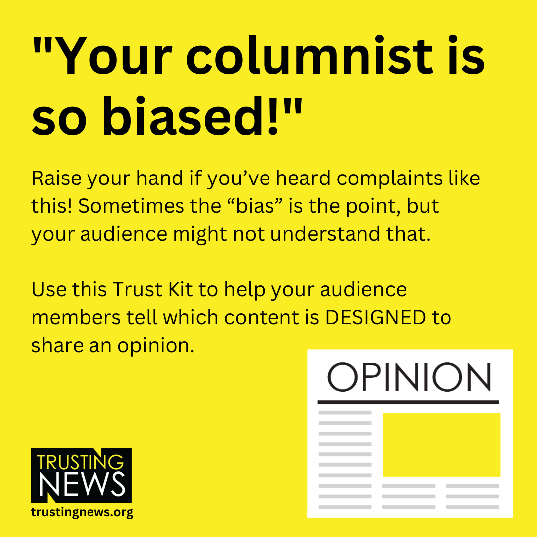 Try adding the word “opinion,” followed by a colon, to the front of your headline. Some content management systems will allow different headlines to be written for different platforms, which can give newsrooms the option to adjust the level of clarity needed.
