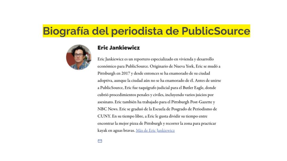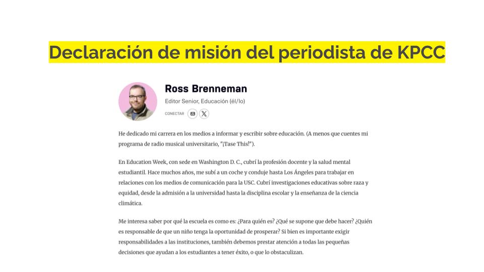 Algunas redacciones convierten la declaración de misión en una tarjeta con foto y la comparten en las redes sociales o las incrustan al final de las historias. Otra idea es incluir un hipervínculo en el nombre del autor en la línea de autor que dirija a una página de biografía donde se incluya tanto su perfil profesional Y su declaración de misión del periodista. Cuando utilices estas declaraciones, recuerda actualizarlas a medida que cambien los objetivos de la cobertura o los tipos de reportajes. También podrías preguntar en la comunidad qué les gustaría ver relacionado con estos temas y considerar enfocar tus coberturas en base a esos comentarios.