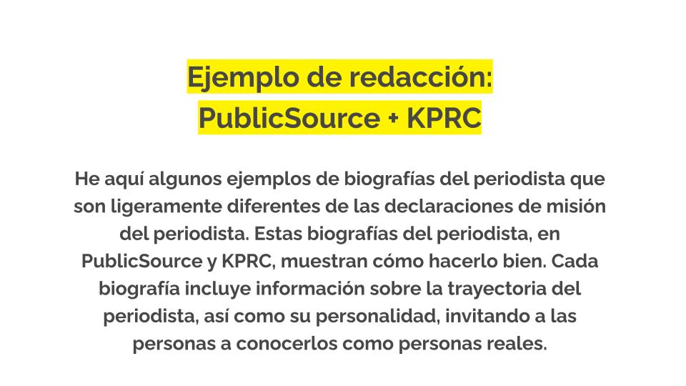 Si quieres inspirarte, haz clic en los siguientes ejemplos de declaraciones de misión y biografías del periodista. Para ver más ejemplos de redacciones, consulta nuestra base de datos de ejemplos de redacciones.