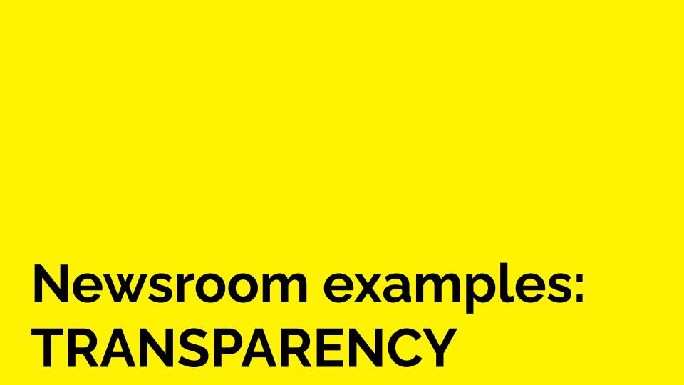 Here are some examples of how newsrooms are injecting transparency in daily coverage. For more newsroom examples, check our our newsroom example database.