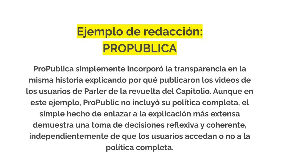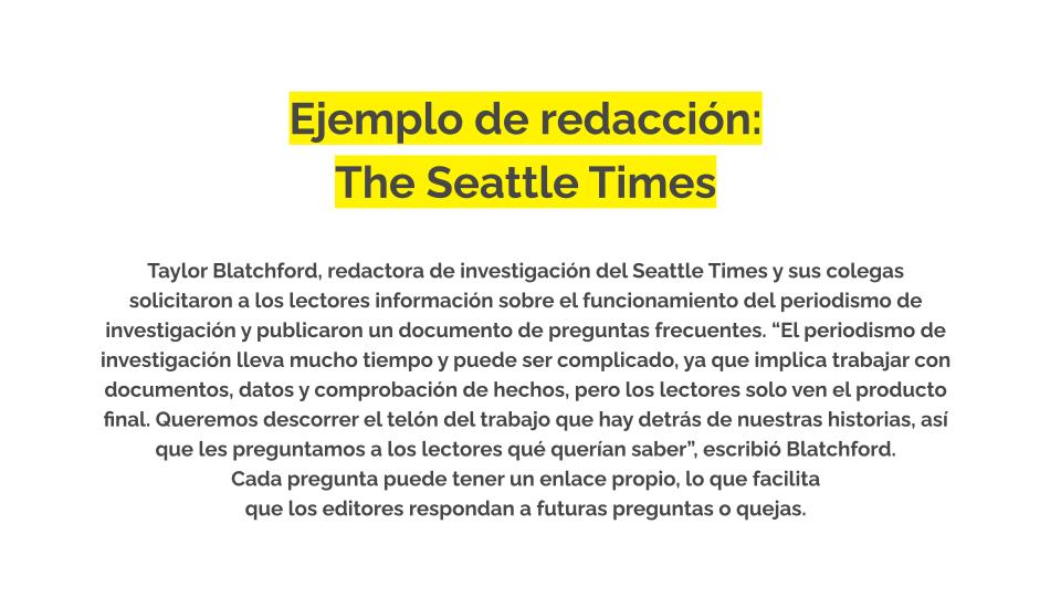 Sabemos, gracias a la investigación, que cuando las redacciones ofrecen explicaciones y conocimientos sobre el proceso informativo pueden ayudar a las personas a comprender mejor tus objetivos y motivaciones, al tiempo que mejoran la percepción de tu organización periodística. También sabemos que este tipo de transparencia ayuda a evitar que las personas
