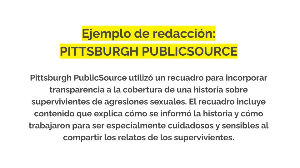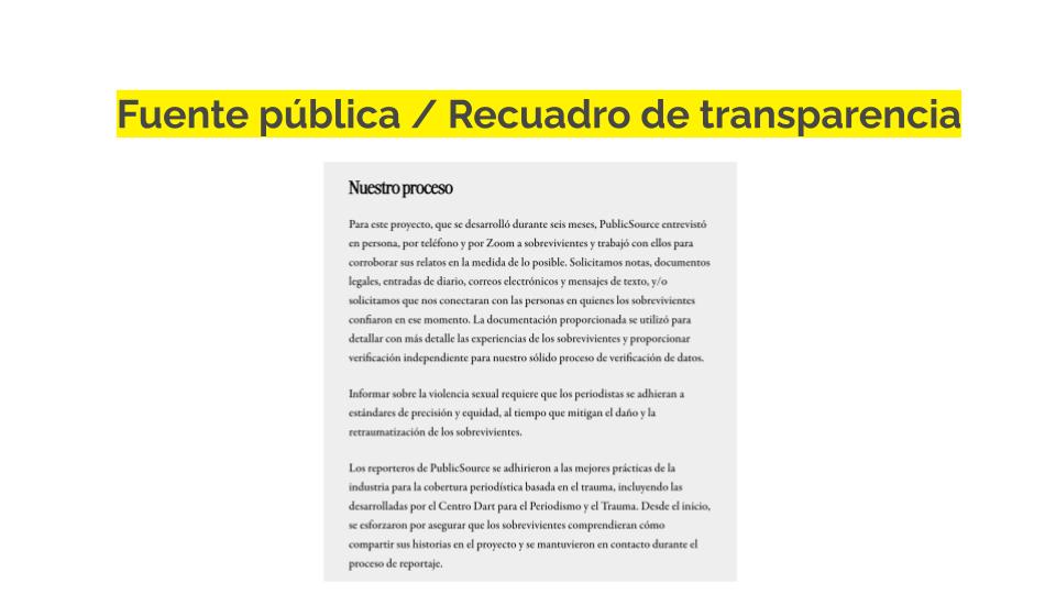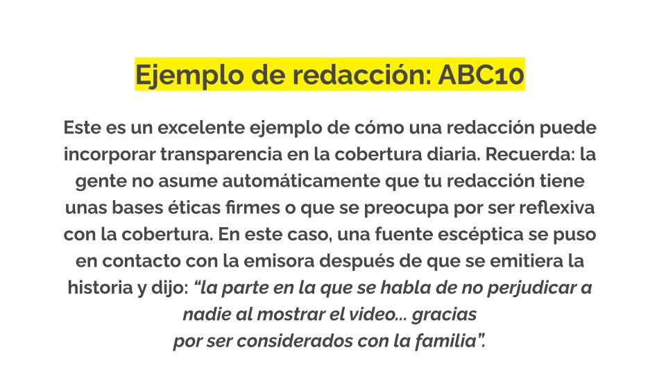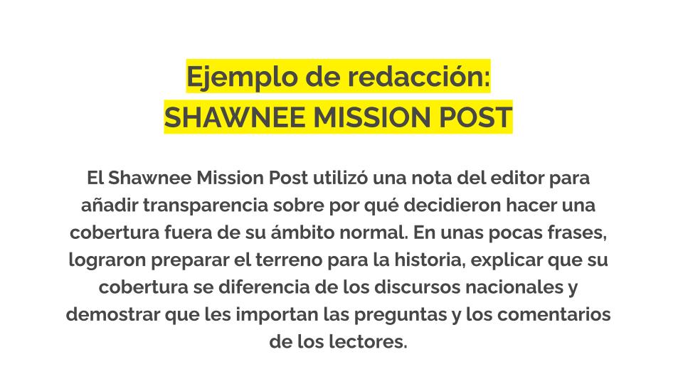Este Kit de Confianza te ayudará a decidir cuándo son necesarios los elementos de transparencia en la cobertura diaria, cómo redactarlos y cómo compartirlos públicamente con tu público.