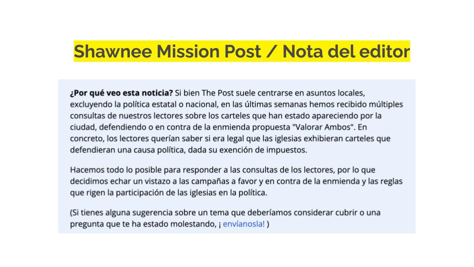 Después, comparte esas respuestas públicamente. Preferimos incorporar transparencia en los lugares en los que ya tienes la atención de la gente, en lugar de recurrir a una columna separada del editor o una nota sobre el detrás de escena. (Y cuando escribas columnas o explicaciones separadas, asegúrate de enlazarlas desde la misma cobertura). En la siguiente sección se explica cómo hacerlo.