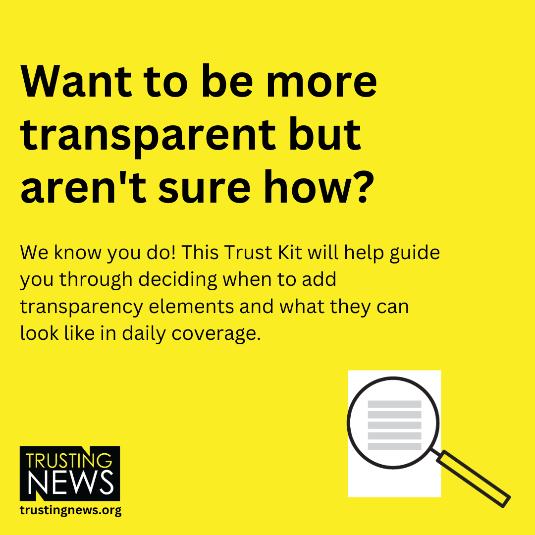 This Trust Kit will walk you through how to decide when transparency elements are needed in day-to-day coverage, how to write them, and how to share them publicly with your audience.