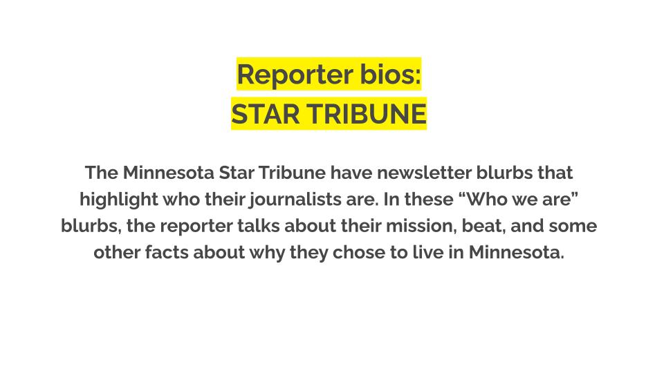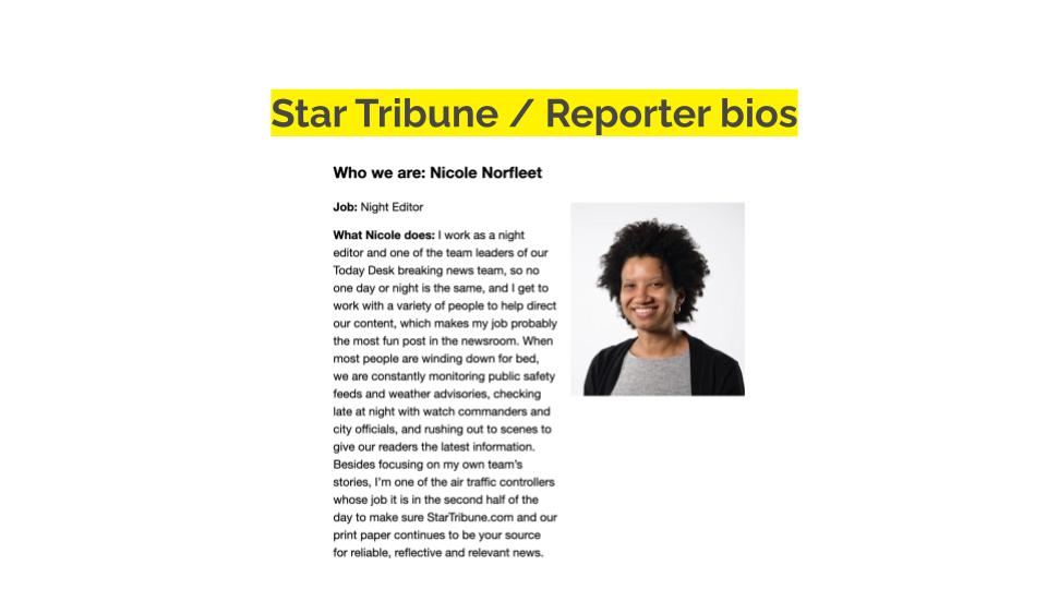 For inspiration, here are some examples of how newsrooms and journalists have shared more about who they are. For more newsroom examples, check our our newsroom example database.