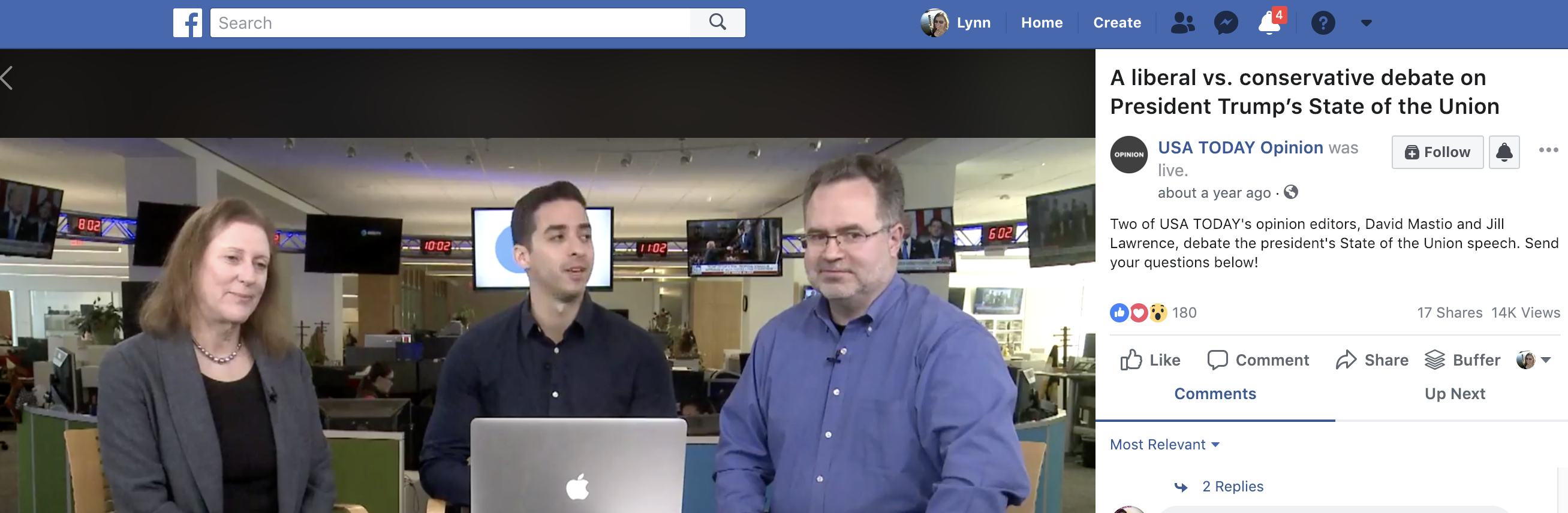 USA TODAY used Facebook LIVE to bring two of their opinion editors with opposing views together to debate the president’s State of the Union speech. The also asked their users to ask questions during the live broadcast.