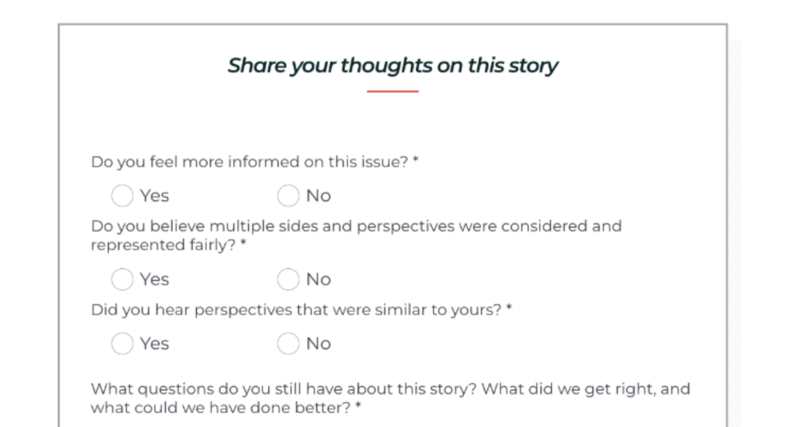The standardized in-story survey includes questions about whether the news consumer felt more informed after reading the online coverage, if they heard a perspective similar to their own, and whether they felt like multiple sides or perspectives were represented fairly.