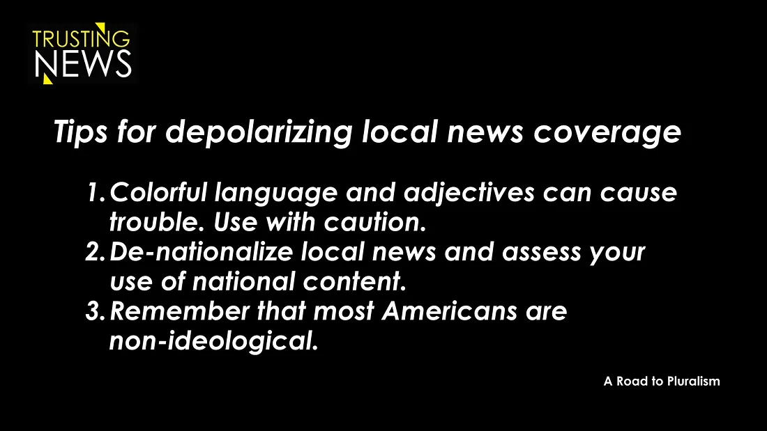 Keeping the focus local can make it more difficult for readers to connect what they see in a local news source to the arguments and stories they are absorbing through their national news consumption, through other websites or cable television. In other words, it’s not all national politics: Think about what “less polarized” means in the context of your community. One size will not fit all.