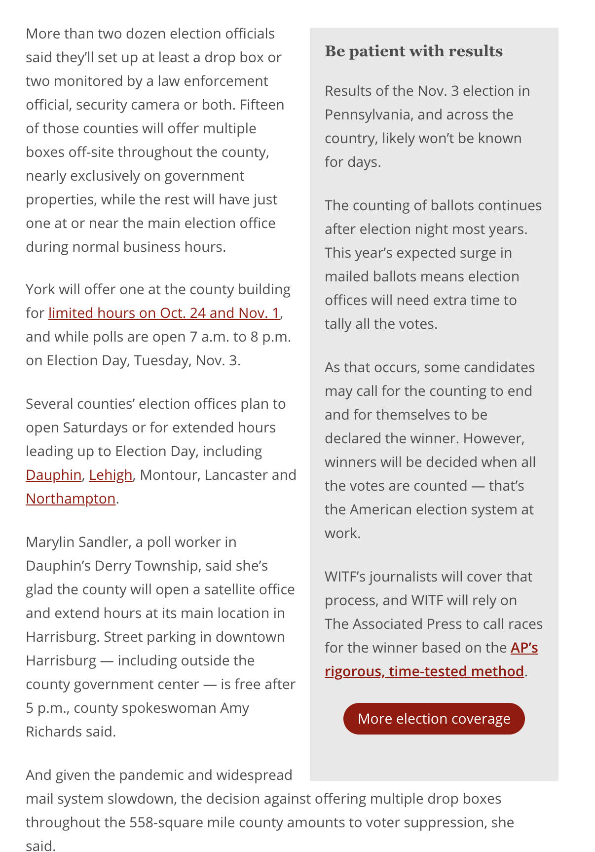 While there are a lot of unknowns ahead of Election Day, there are things we as journalists can do to help manage our audiences’ expectations and prepare them for what to expect. One of those being telling people that there may not be results for days, possibly even weeks, after Election Day. WITF In Pennsylvania did this by running a box alongside the station’s voting stories and election previews that explains why the public shouldn’t expect election results on election night. The box reads: “Results of the Nov. 3 election in Pennsylvania, and across the country, likely won’t be known for days. The counting of ballots continues after election night most years. This year’s expected surge in mailed ballots means election offices will need extra time to tally all the votes.”